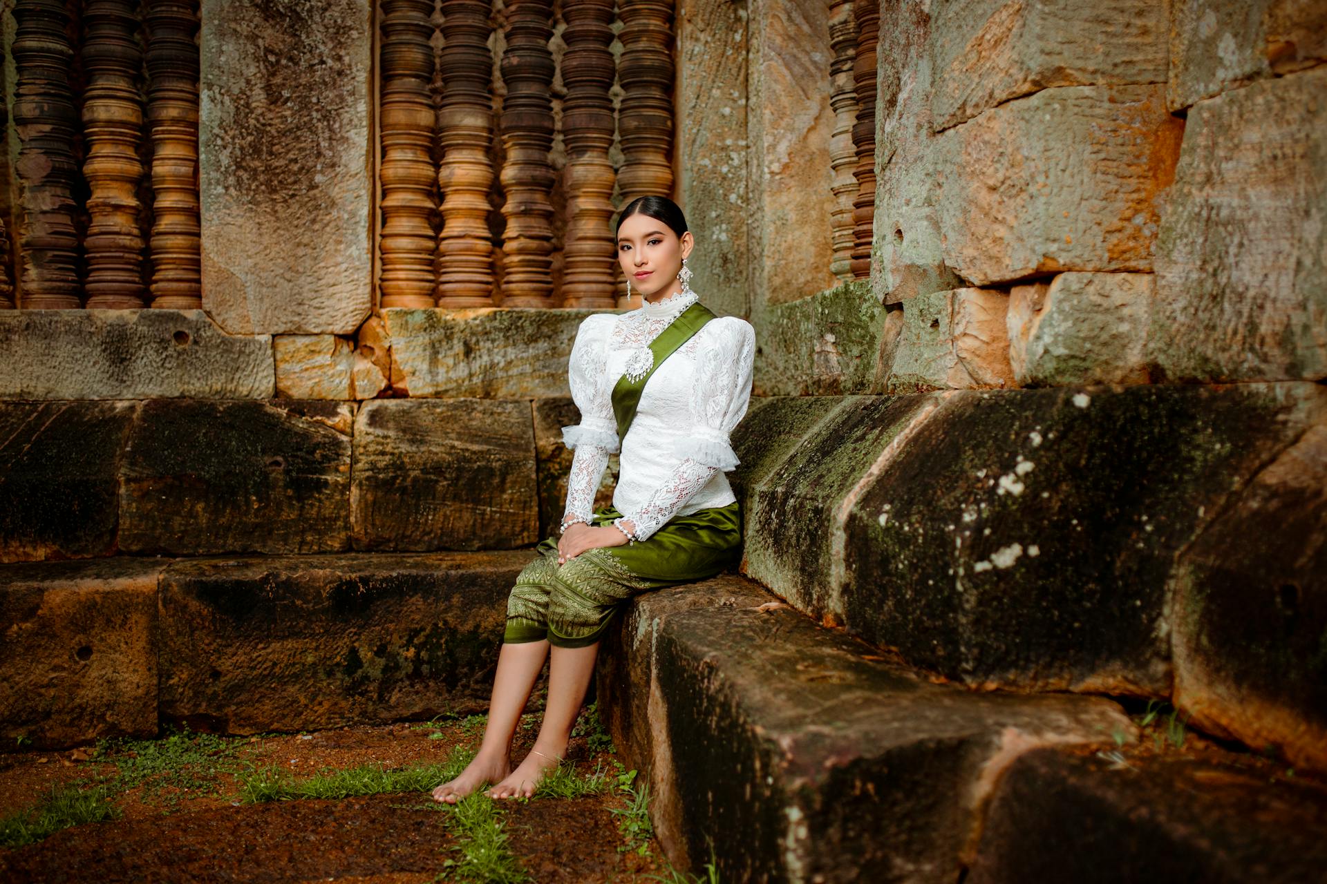 一名身着民族服饰的柬埔寨人走进吴哥窟寺庙
