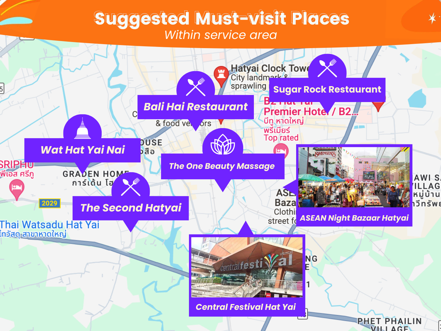 搭乘私人包车,探索合艾最美的风景!您可以乘坐一辆可载 9 名乘客的现代化多功能车,在专业司机的陪伴下,安全舒适地游览整个城镇。您也可以选择添加导游,带领您完成整个旅程。沿途欣赏壮丽的景色——省份、城市化等之间的风景过渡——山峰、肥沃的稻田、不拘一格的水上市场,以及每位游客都在寻找的全方位乡村氛围。司机将从您的接送地点接您,带您前往城市的主要景点。别忘了带上您的行程,或者如果您愿意,您可以在前往最终目的地的途中计划行程。现在就预订吧,因为穿越合艾奇观的每一英里都值得旅行