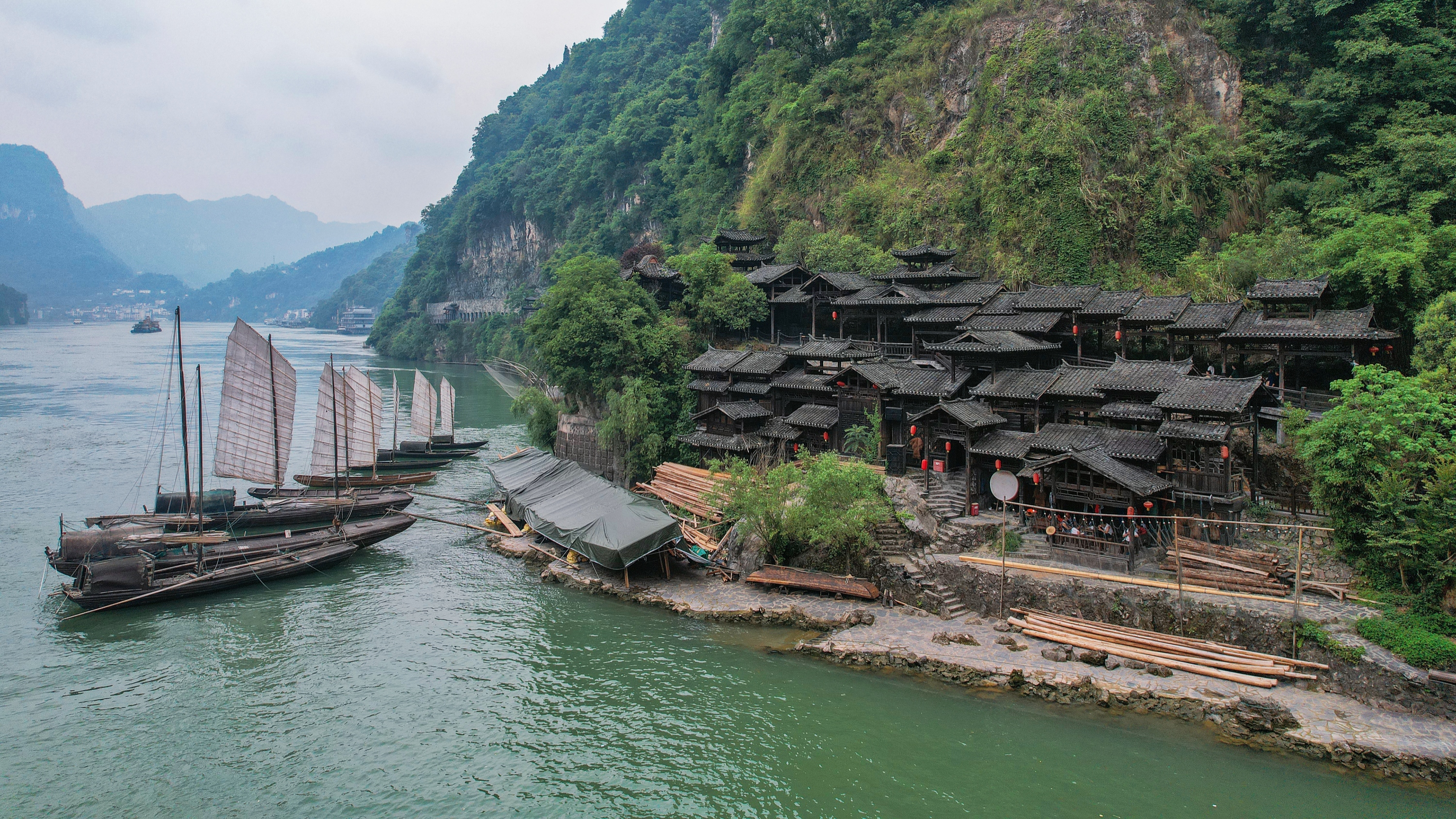 久违的古帆船、乌篷船安静地泊在三峡人家门前,溪边少女挥着棒槌在清洗衣服,江面上悠然的渔家在撒网打鱼……