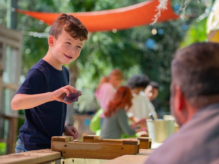 随着男孩探索化石和宝石开采活动,发现隐藏的宝石
