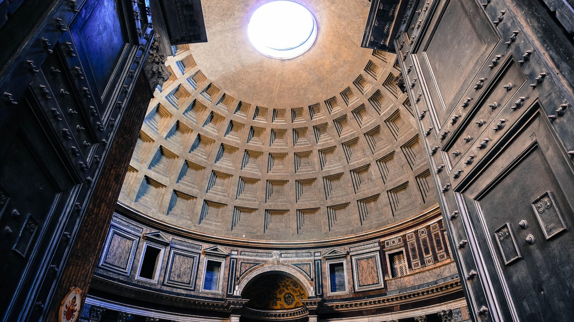 巨大的青铜门框住了万神殿复杂的建筑和和谐的设计