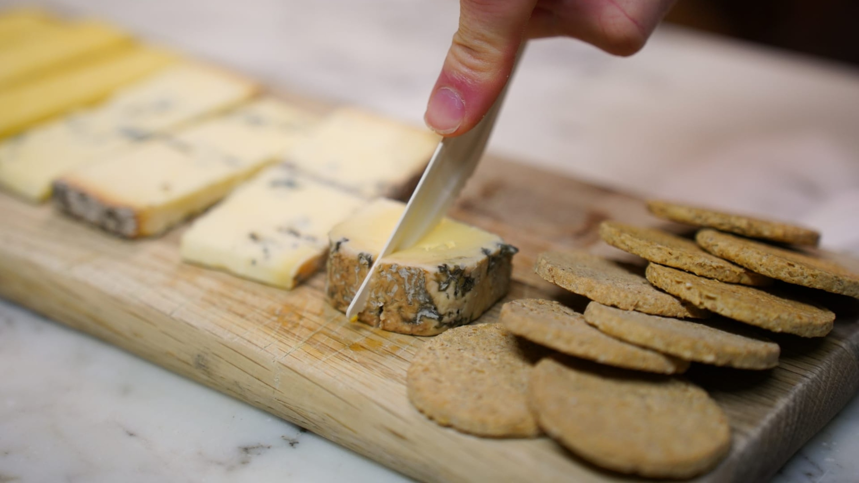 苏格兰奶酪精选,精美摆放在质朴的木板上,供客人享用