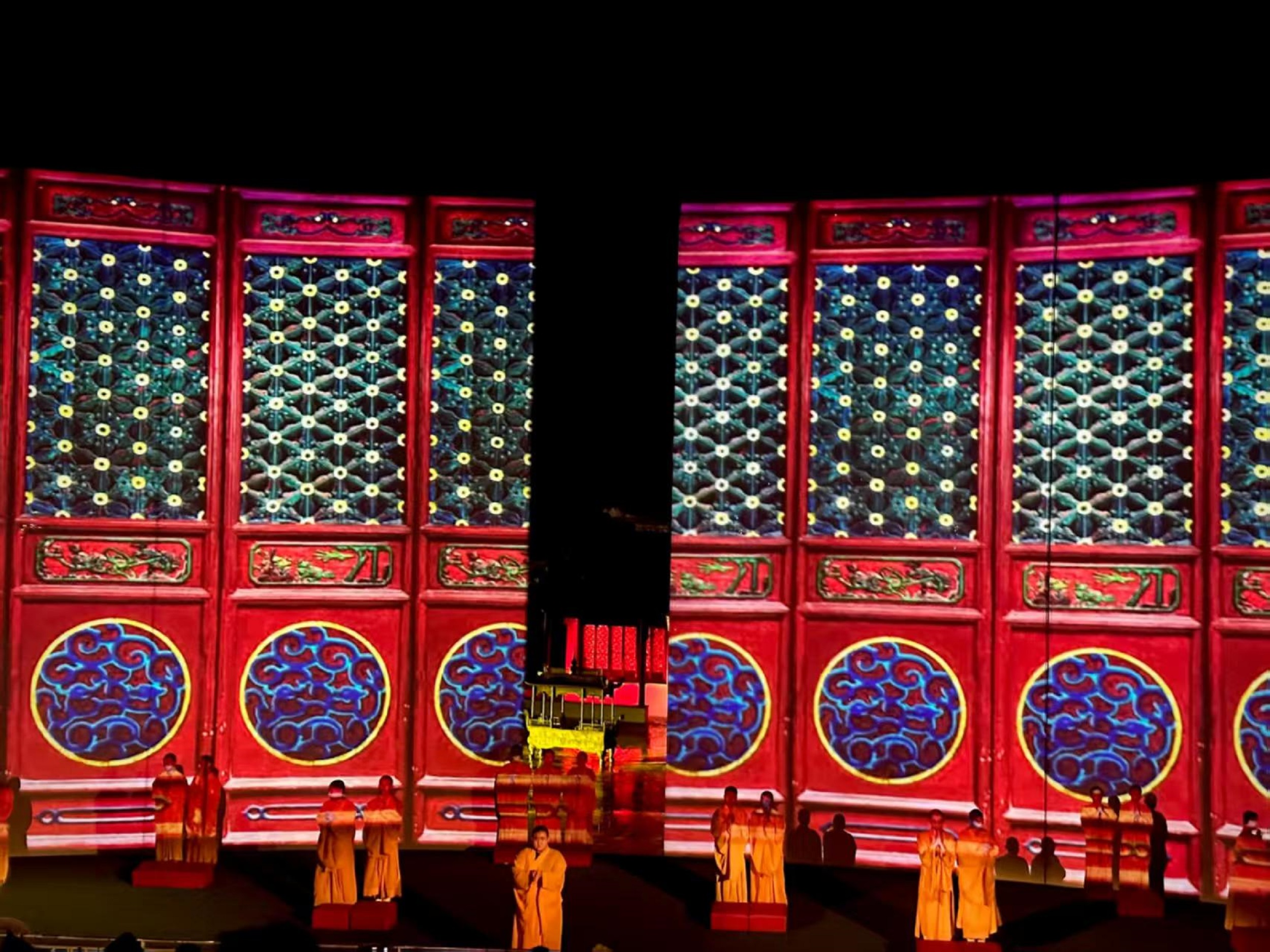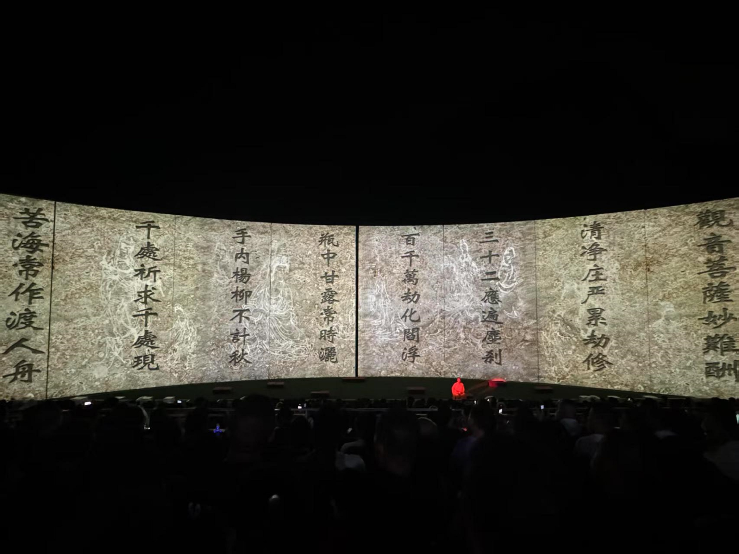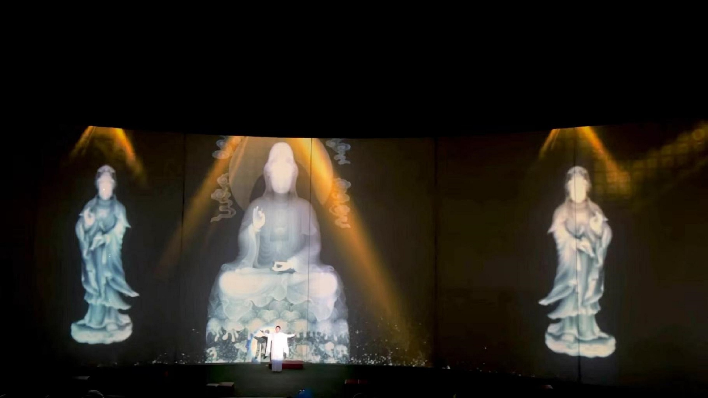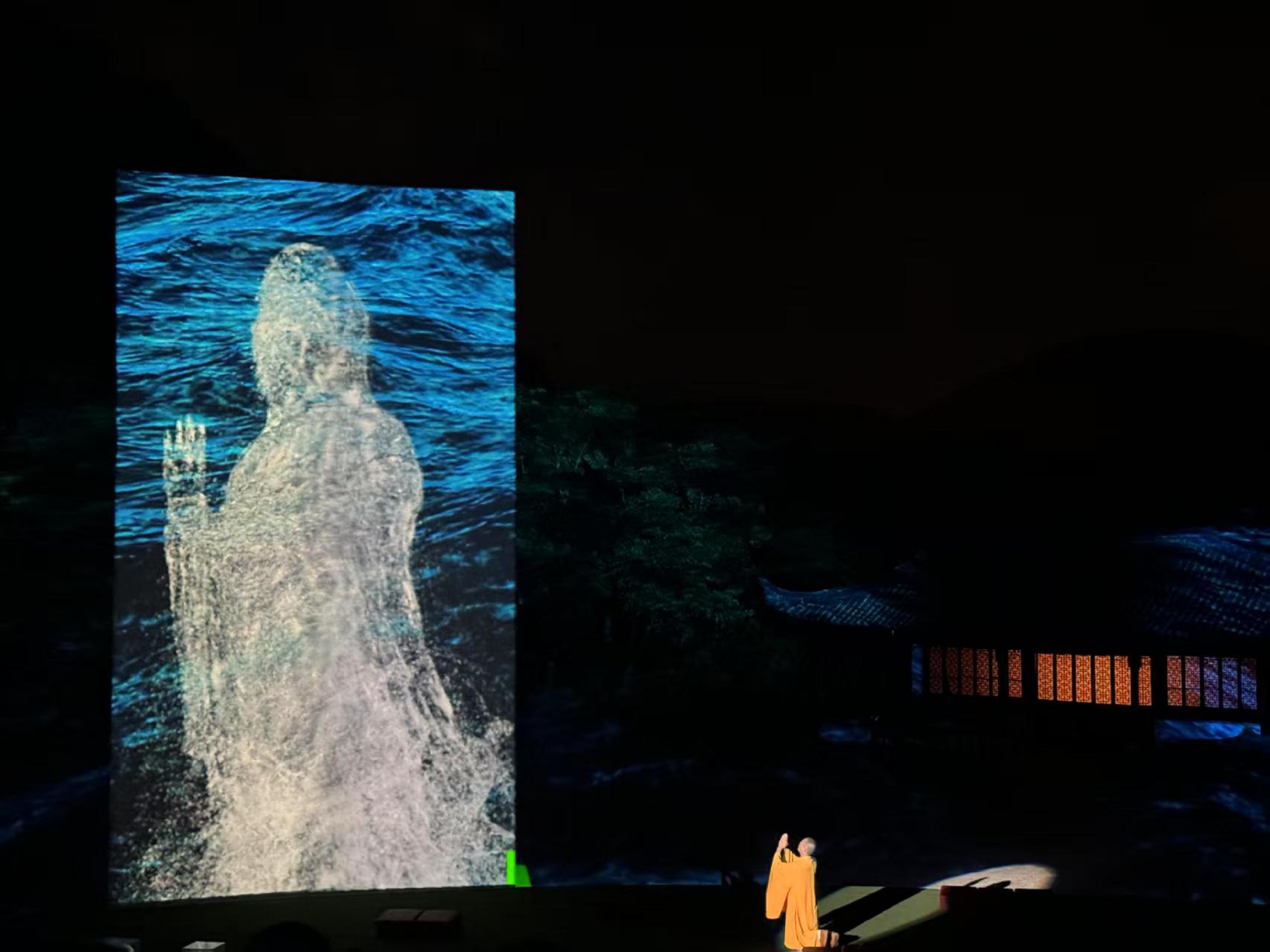 随着舞台灯光变幻,一幅幅精美的布景缓缓展开,观音菩萨的慈悲形象在光影中若隐若现