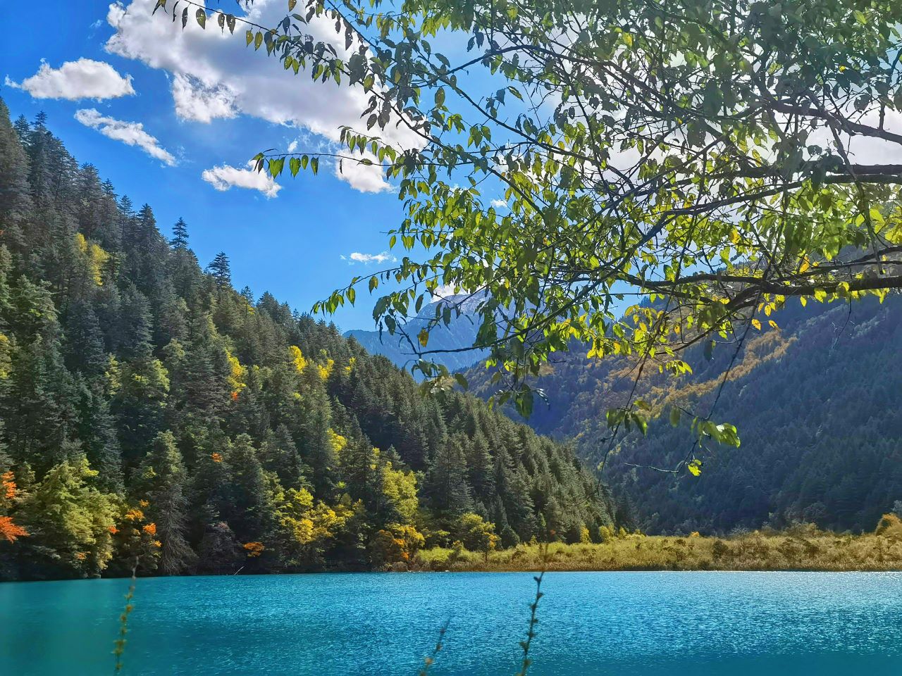 湖水呈现出独特的蓝绿色,清澈透亮,能倒映出周边景象。树枝挂着黄褐与黄绿相间的叶子,景色优美且富有层次感