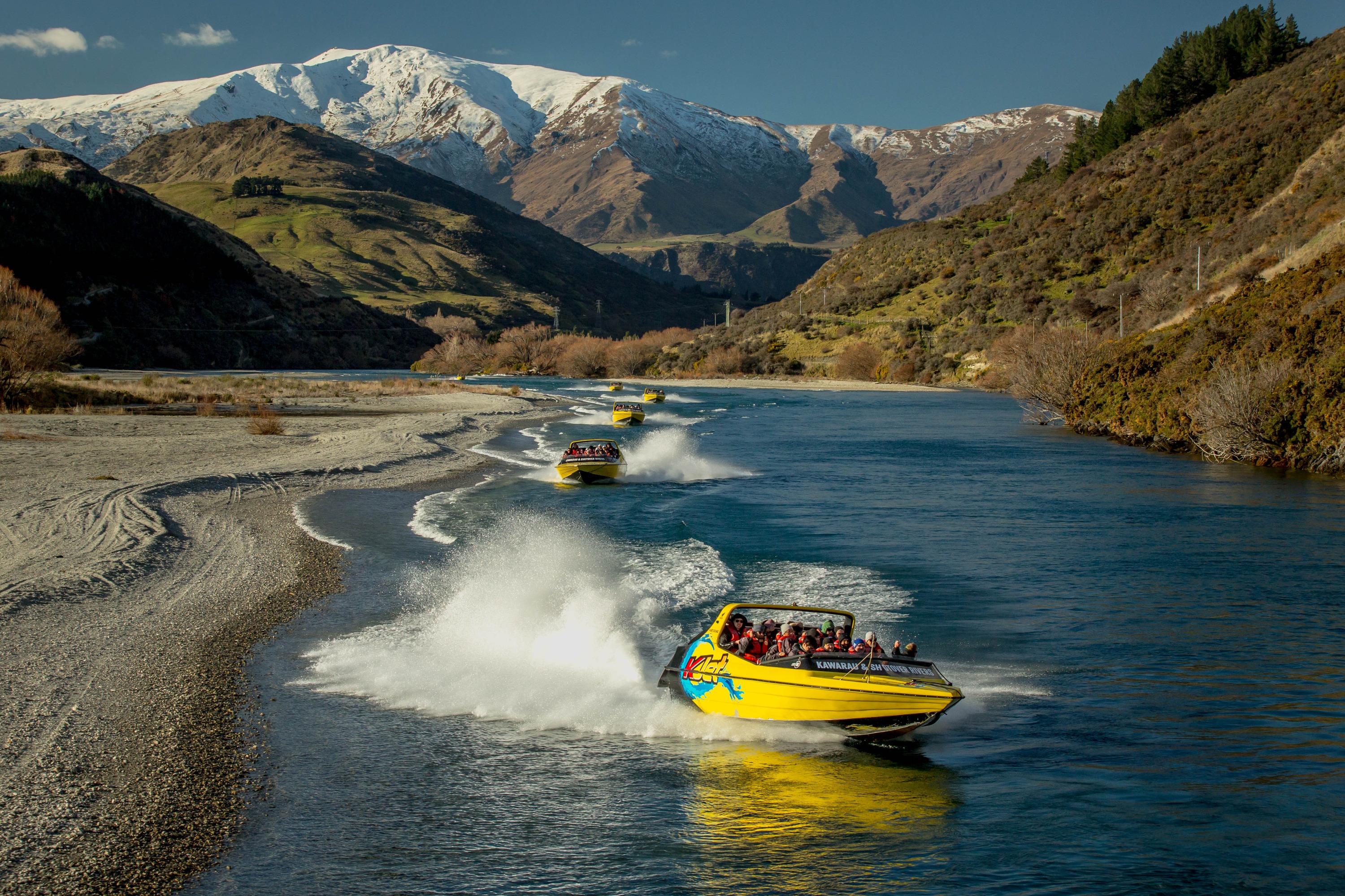 编织的 Shotover 河,以高达 95KPH 的速度在浅河道上奔流