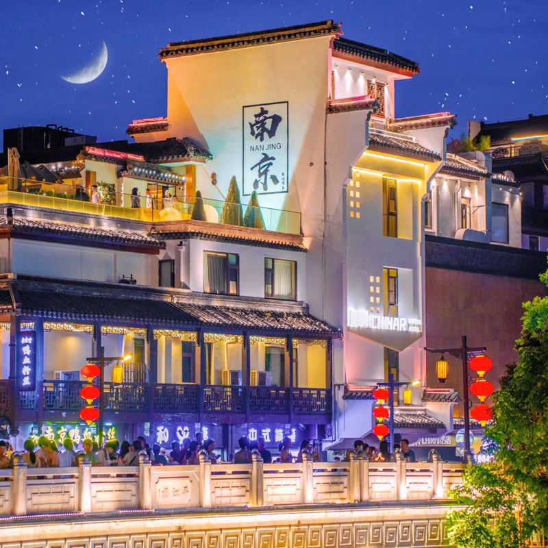 夜幕降临时,秦淮河上灯影摇曳,夫子庙小吃街香气四溢,人群穿梭于古街旧巷,沉浸在热闹烟火中。