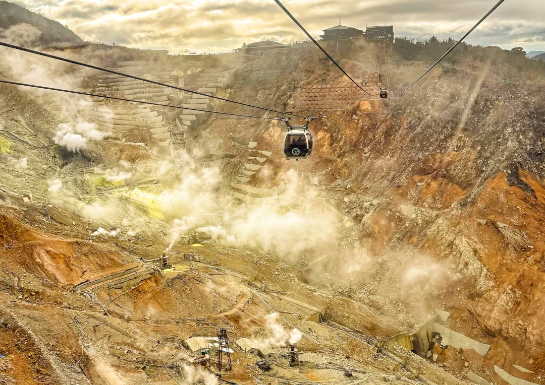 "乘大涌谷缆车凌空俯瞰火山奇观,震撼于硫磺蒸汽与富士山同框的原始野性之美。"(含单程费用)