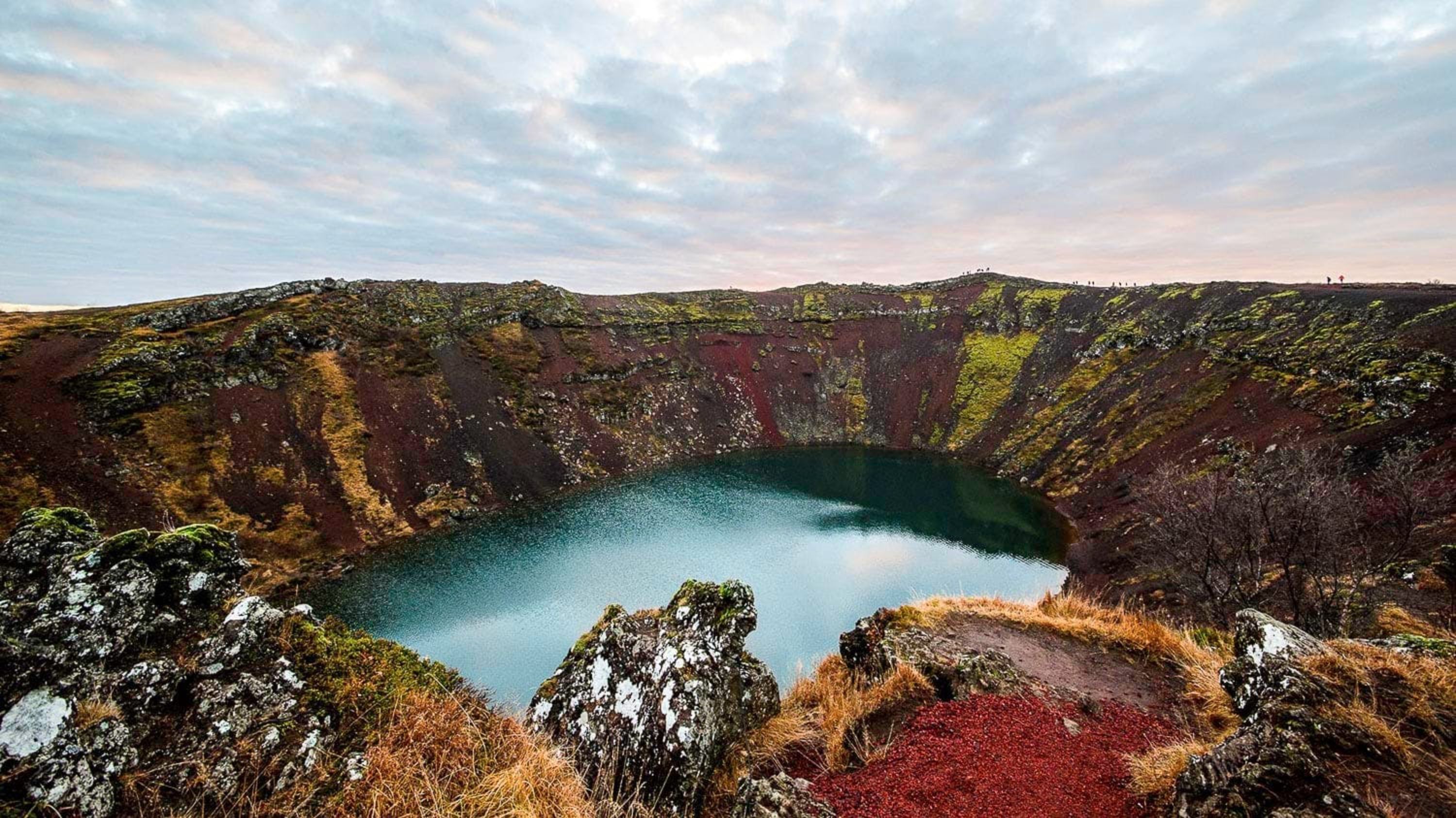 凯里德火山口拥有鲜艳的红色岩石、深蓝色的湖泊和茂盛的苔藓