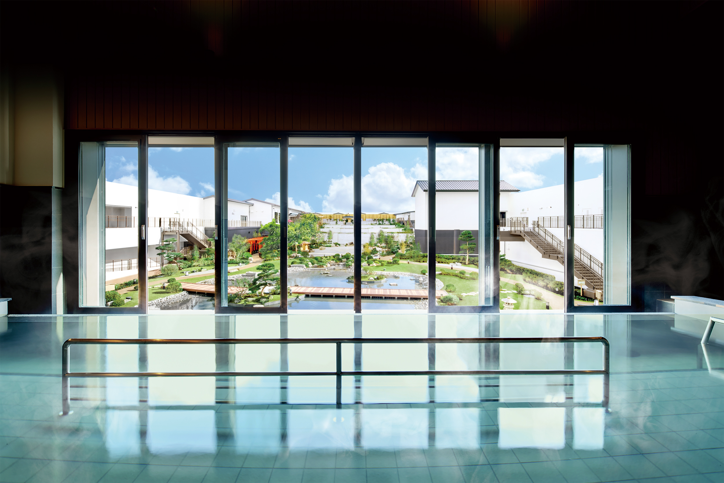 在可以眺望天空庭园的「赏庭温泉」里放松,泡汤赏景好不惬意