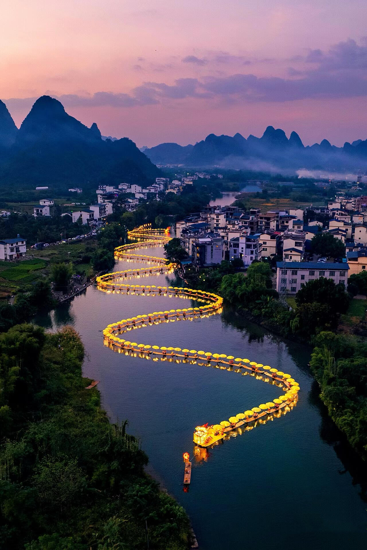 日暮遇龙河,看灯火竹筏蜿蜒碧波,群山朦胧,开启一场梦幻的山水夜行