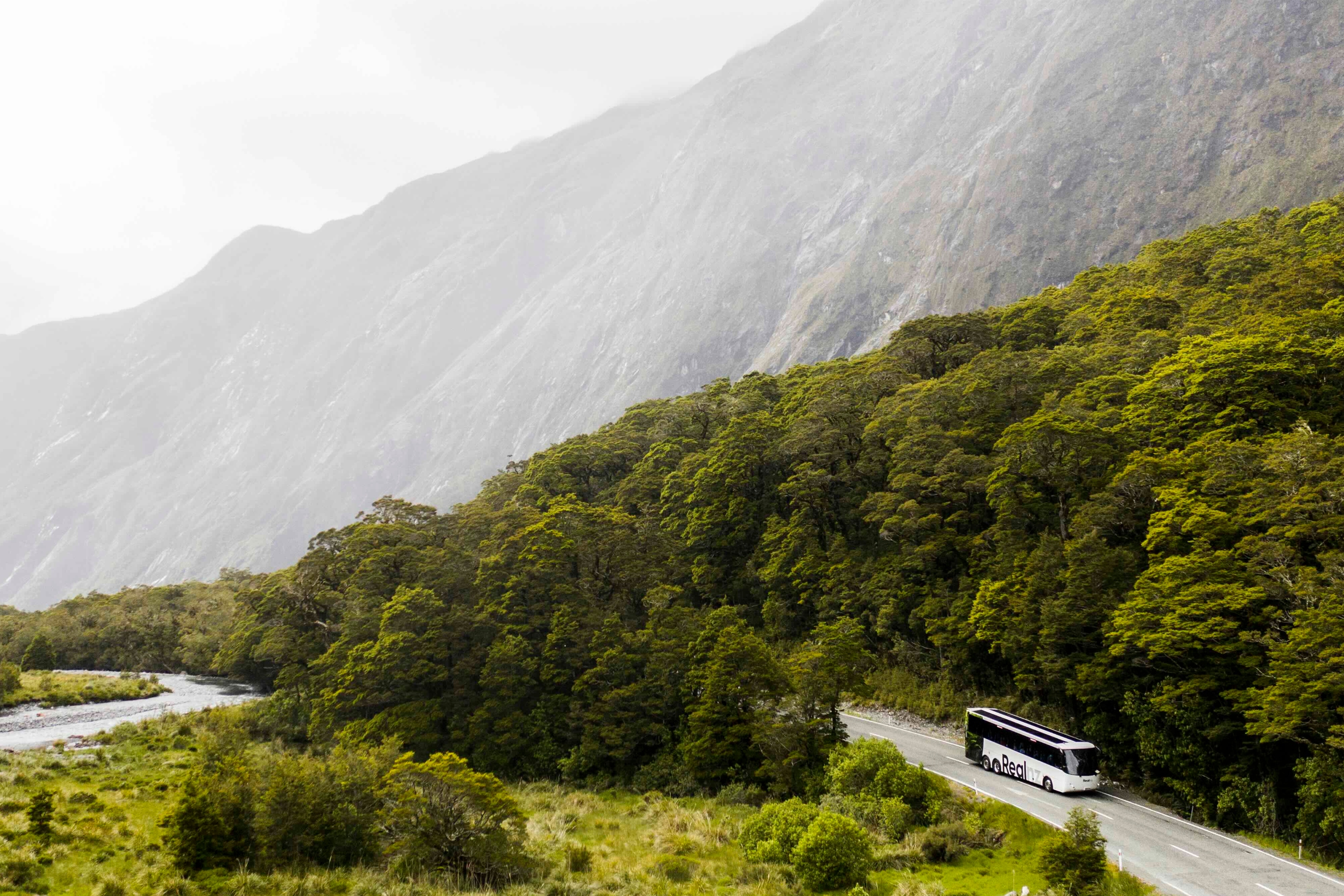 在米尔福德峡湾一日游中,您可以乘坐巴士欣赏郁郁葱葱的绿色植物和风景如画的景观。