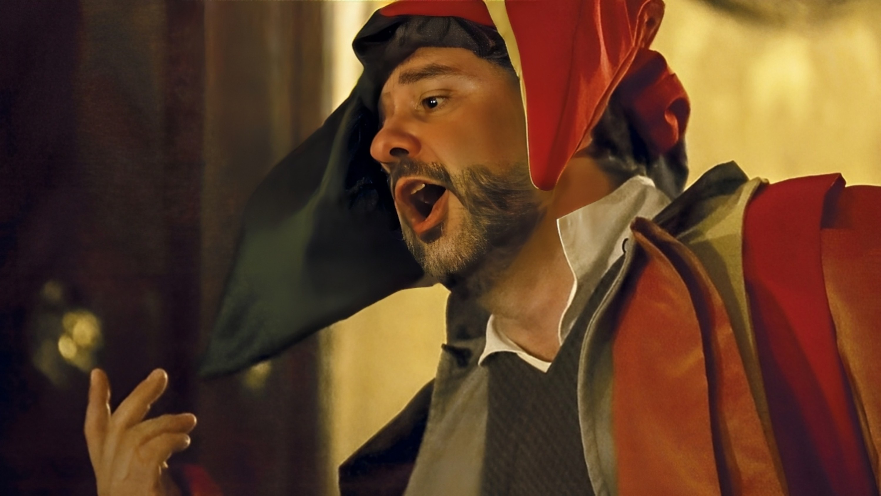 宫廷歌剧中,一位充满活力的角色身着盛装,演唱了一首气势磅礴的咏叹调