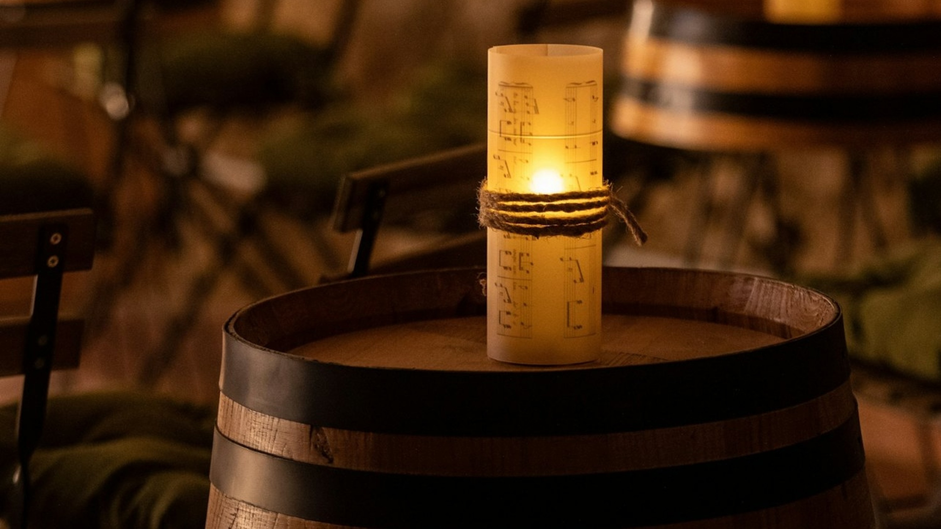 质朴的桶式桌子,配有发光的灯饰中心,为舒适的空间增添特色