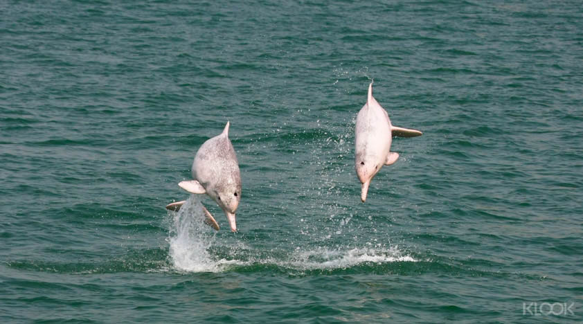 海豚是非常聪明的动物,而且充满好奇心,乐于跟人类及其他生物接触,或许你们也听说过海豚在海上保护人类的故事,可见它们机智,而且有灵性。全球极罕的中华白海豚(又称粉红海豚),刚出生时,其实跟一般的海豚一样是黑色的,然而由于独特的基因,他们会随年渐长褪成淡灰色,然后慢慢变成全粉红。它们跟人类一样喜欢群体生活,所以游览时好可能会遇上粉红母豚与黑色幼豚同游的温馨景象。遇上天气与心情好的日子,海豚们更会落力跳上水面「表演」,不过,我们在观赏的时候千万别发出太大的声响,否则会把它们吓跑哦!