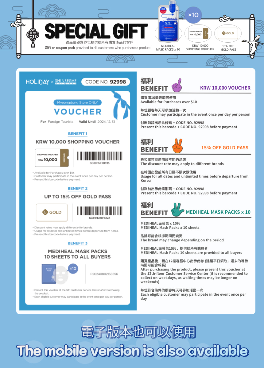 新世界免税店明洞店也提供免费面膜包x10活动和电子版
