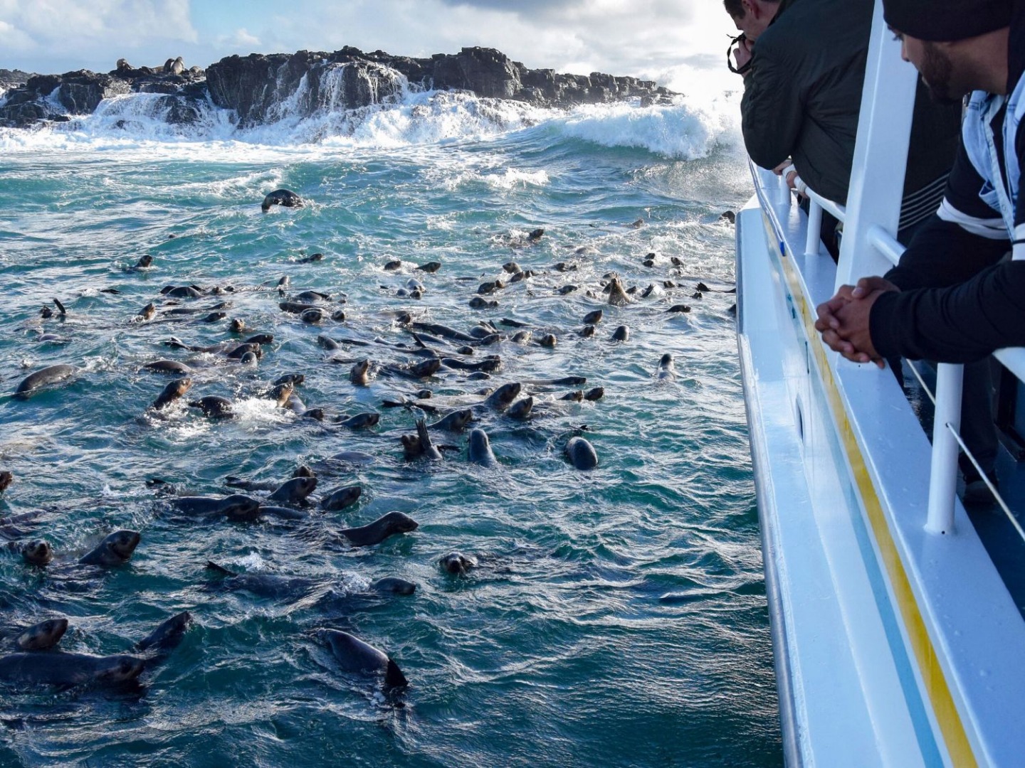 海豹在水中嬉戏或在岩石上享受日光浴,从船上欣赏美景