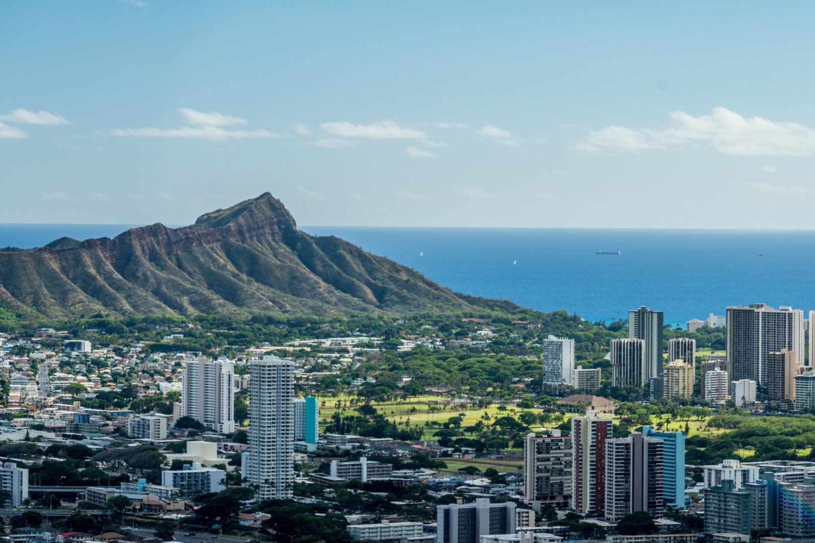 步行至坦塔罗斯观景台,惊叹于威基基和火奴鲁鲁的天际线
