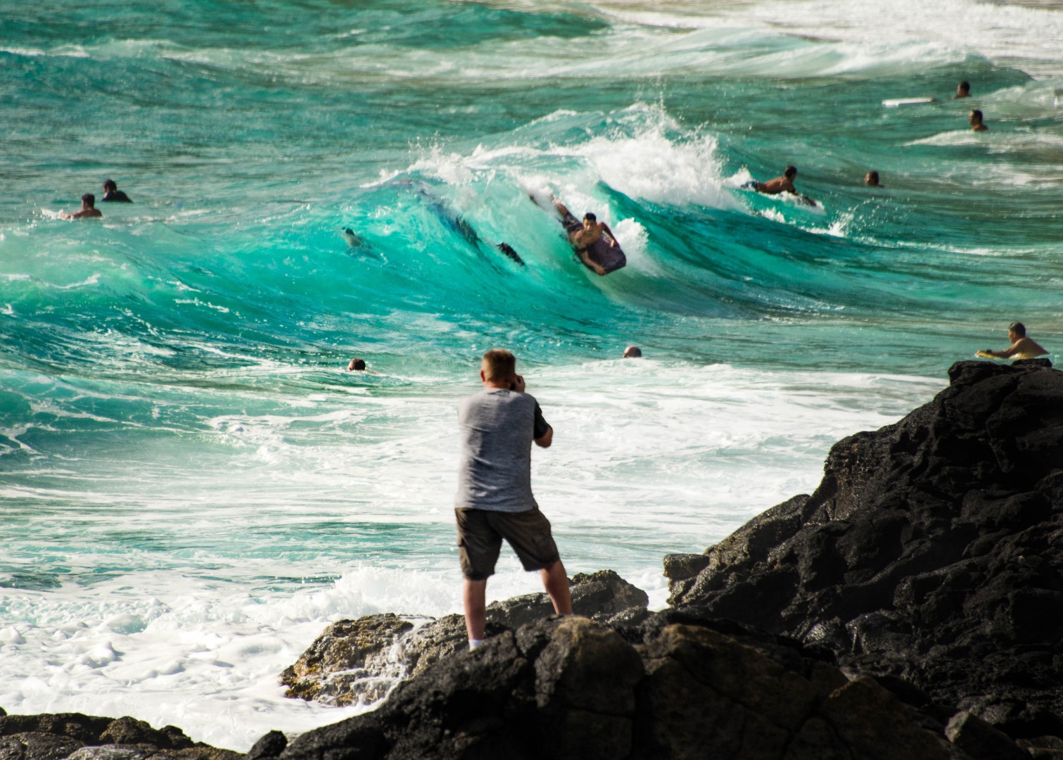观看并拍摄人们在瓦胡岛雄伟水域冲浪和游泳的照片