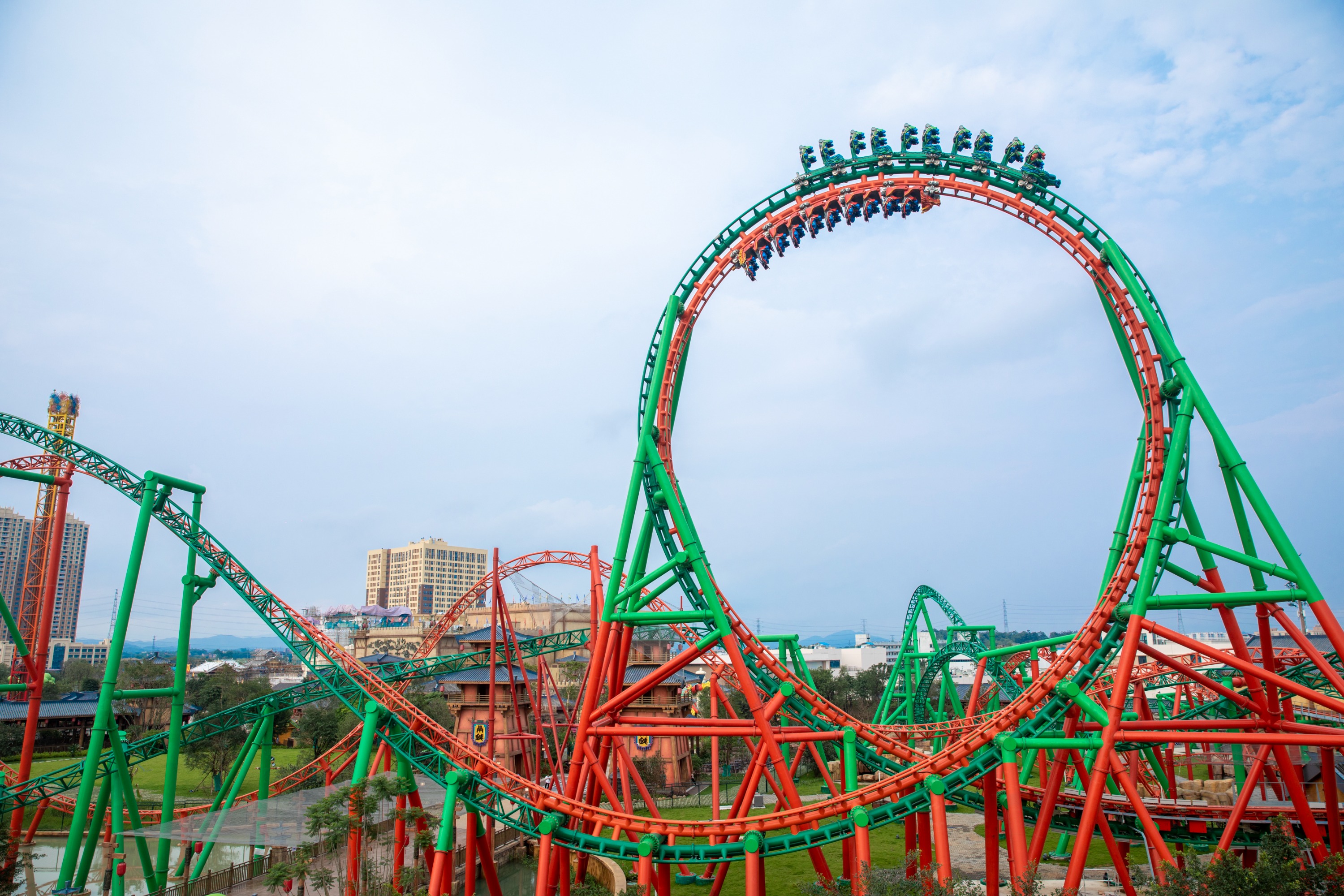 【双龙飞舞】可乘坐可悬挂,可单双轨相互变化,这就是广州融创乐园独创的双轨双车过山车。乘客可根据喜好选择乘坐方式,两车同时发射,时而比肩竞速,时而惊险交错,两车近乎碰撞的感官冲击带给游客无限刺激感。
