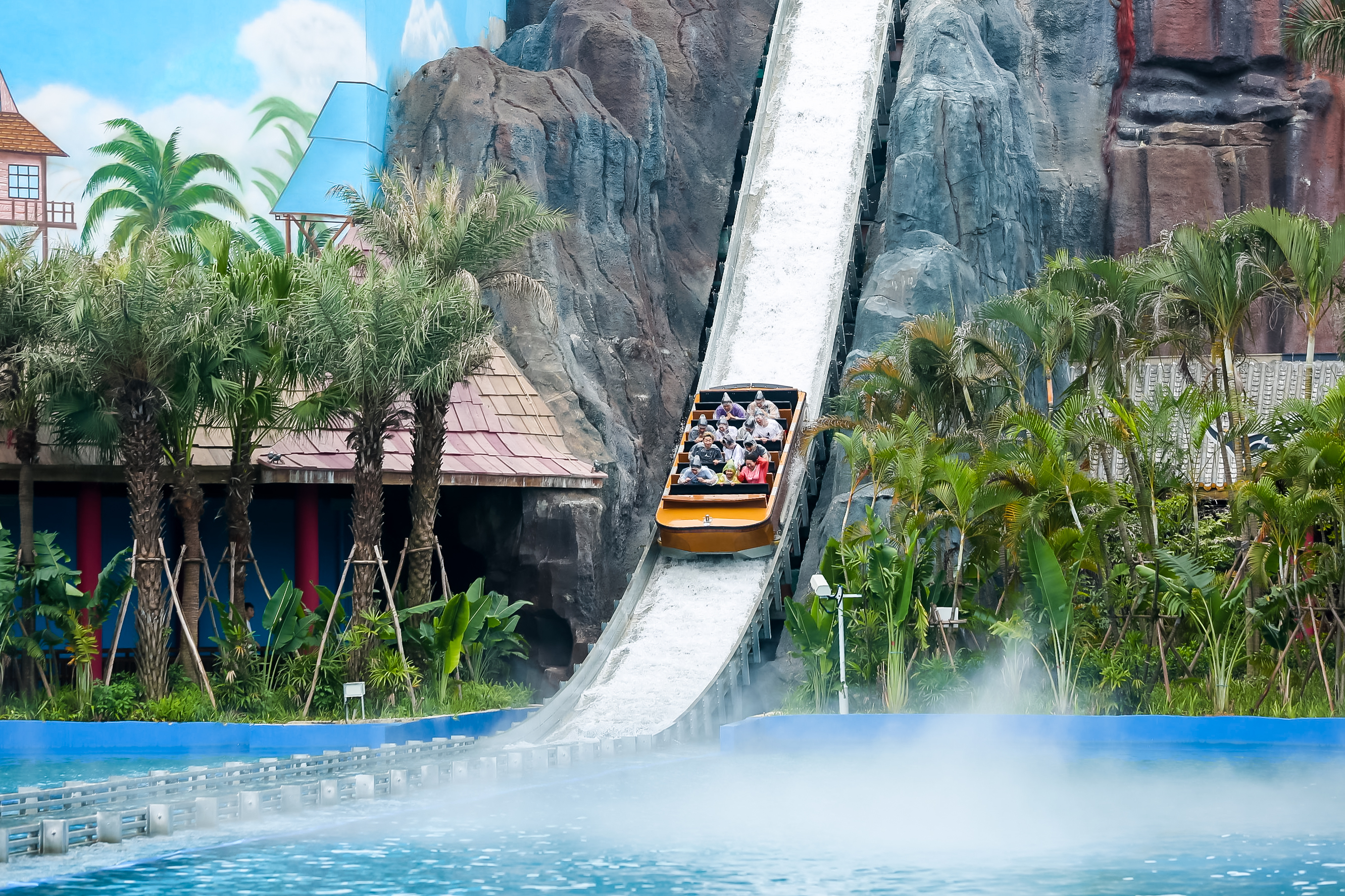 【怒海狂涛】激流勇进与过山车相结合的全新刺激体验。黑暗的水道忽而垂直倾斜提升,忽而旋转倒滑,与此同时洪水、大火呼啸而来,在双重刺激中,湿身体验世界末日的暴击之旅。