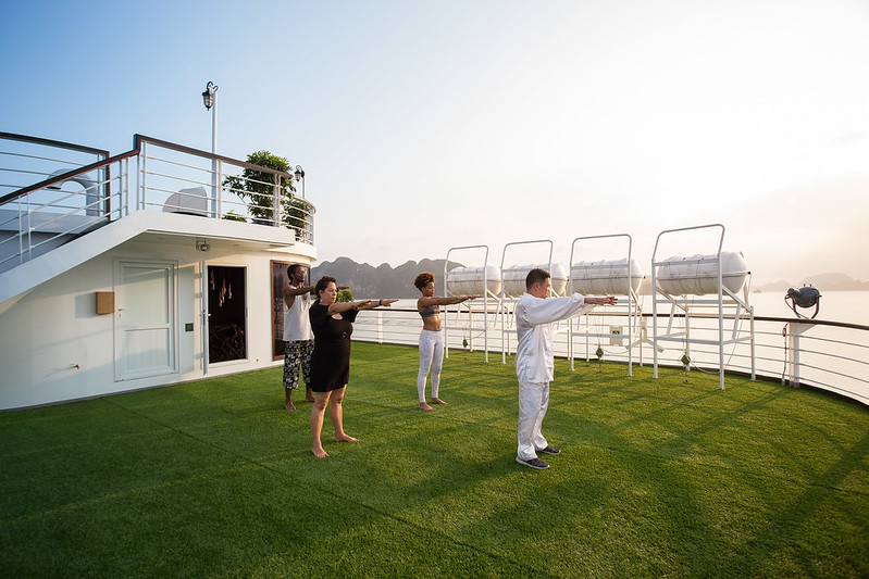 在甲板上参加太极班并观看日出,开始充满活力的一天