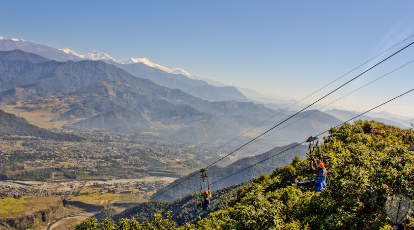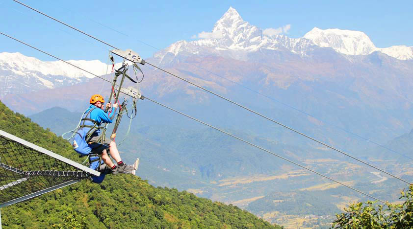 垂直落差 2,000 英尺,距离 1,800 米,倾斜 56 度:在世界上最陡、最高和最快的高空滑索上,这接近两分钟的高速失重状态! ZipFlyer 由 Highground Adventures 独家提供,带您穿越令人难以置信的森林绿地,背景是迷人的 Mt. Machhapuchchhre(鱼尾山),同时您在下山途中加速至高达 120 公里/小时的速度。睁大眼睛,在世界上最极端的高空滑索体验之一中享受近乎自由落体的刺激快感!
