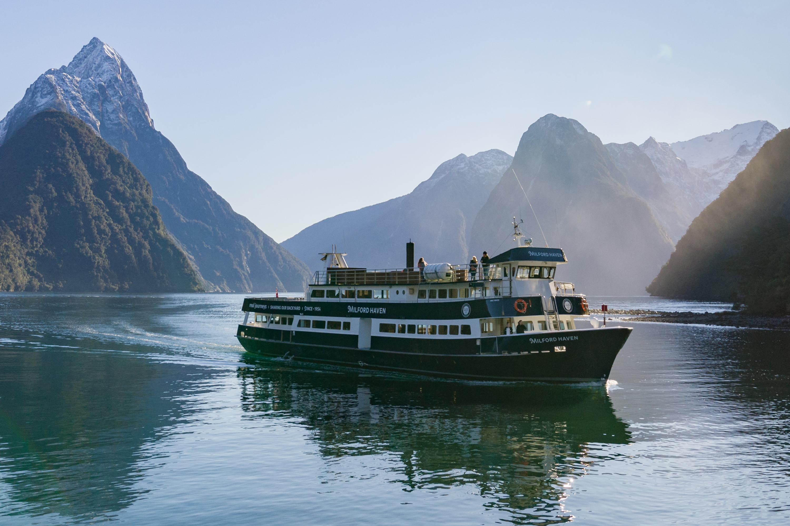 乘坐RealNZ的米尔福德峡湾避风港游轮,体验壮丽的景色和宁静的水面