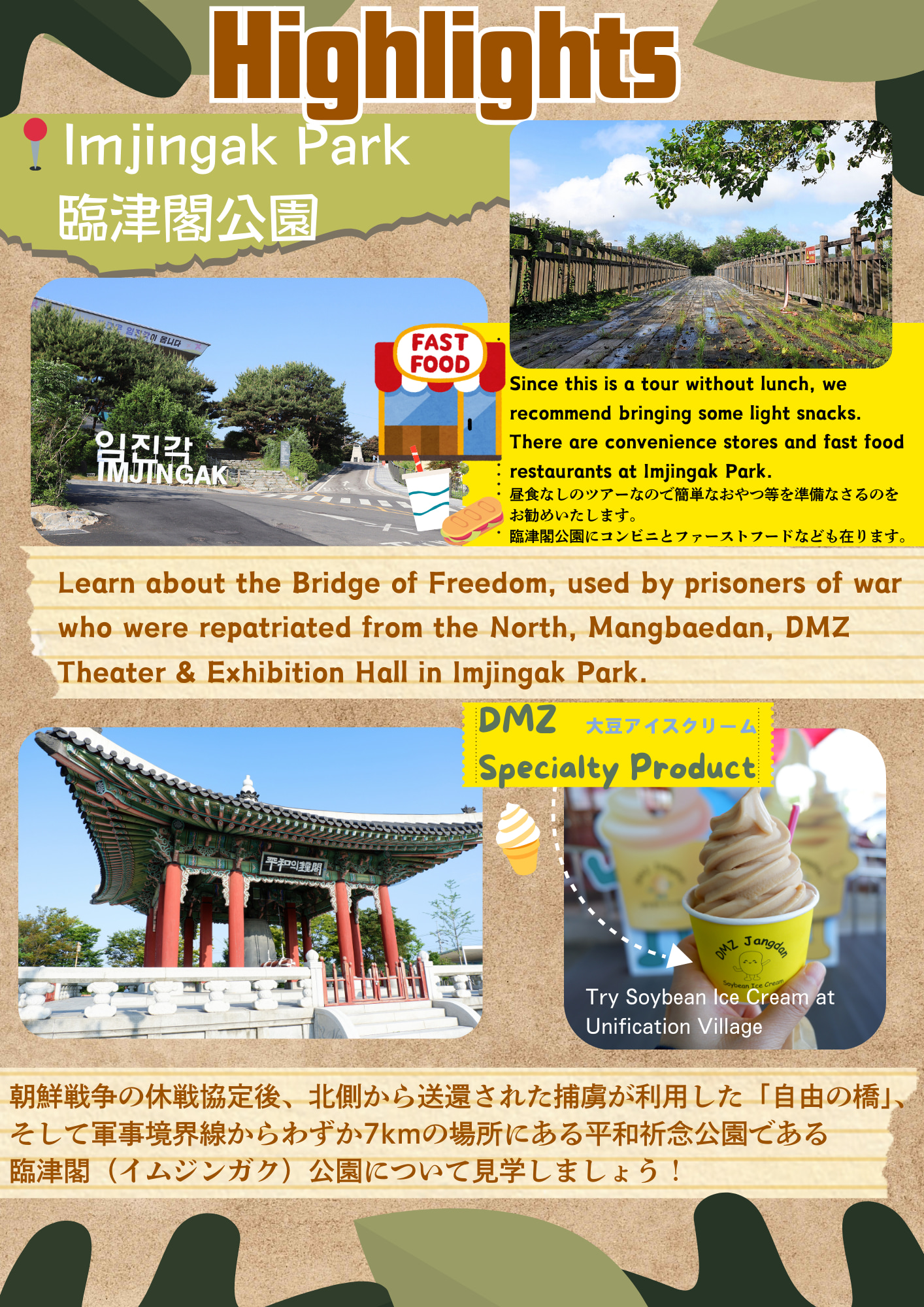 进入临津阁公园。参观自由之桥。探索第三渗透隧道,这是一条朝鲜在非军事区下方修建的未完工通道。步行进入隧道内部。