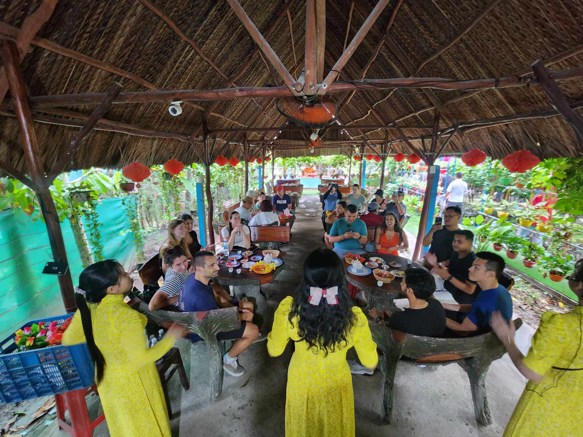 一边品尝当季水果和蜂蜜茶,一边聆听现场越南民俗音乐
