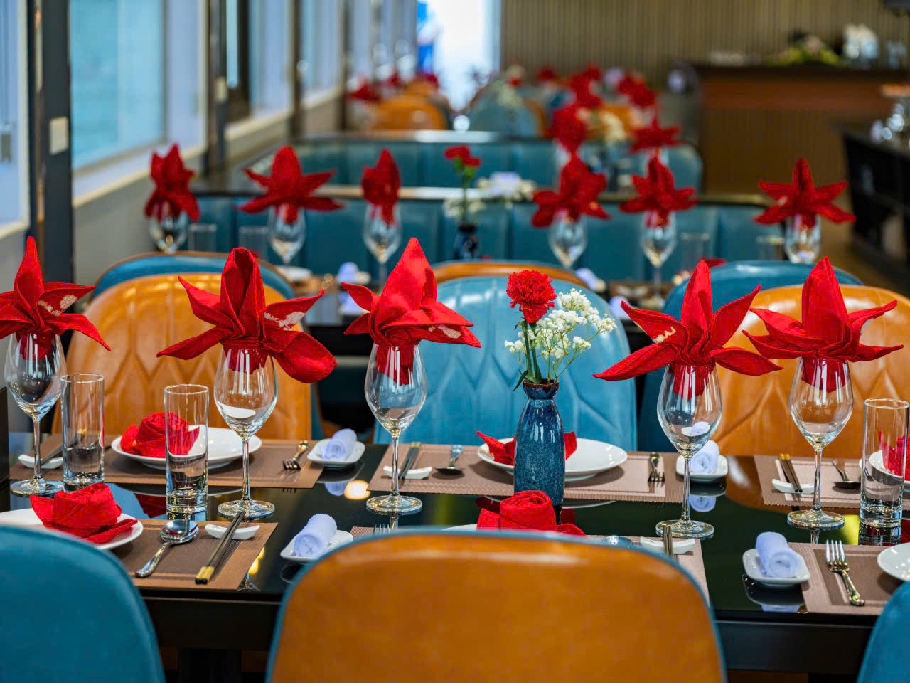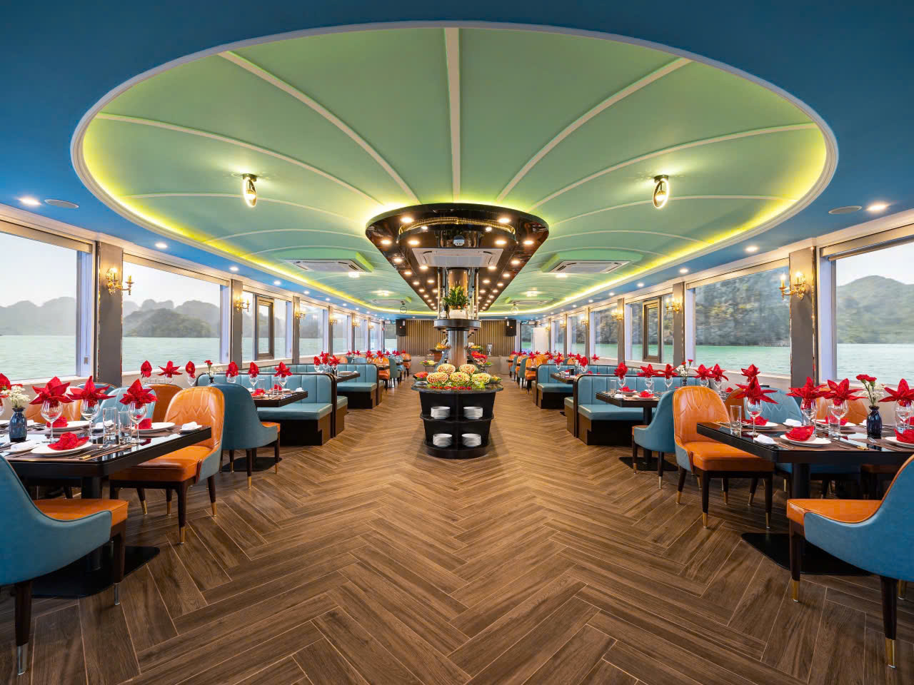 在船内用餐时,可以透过敞开的窗户欣赏外面的景色