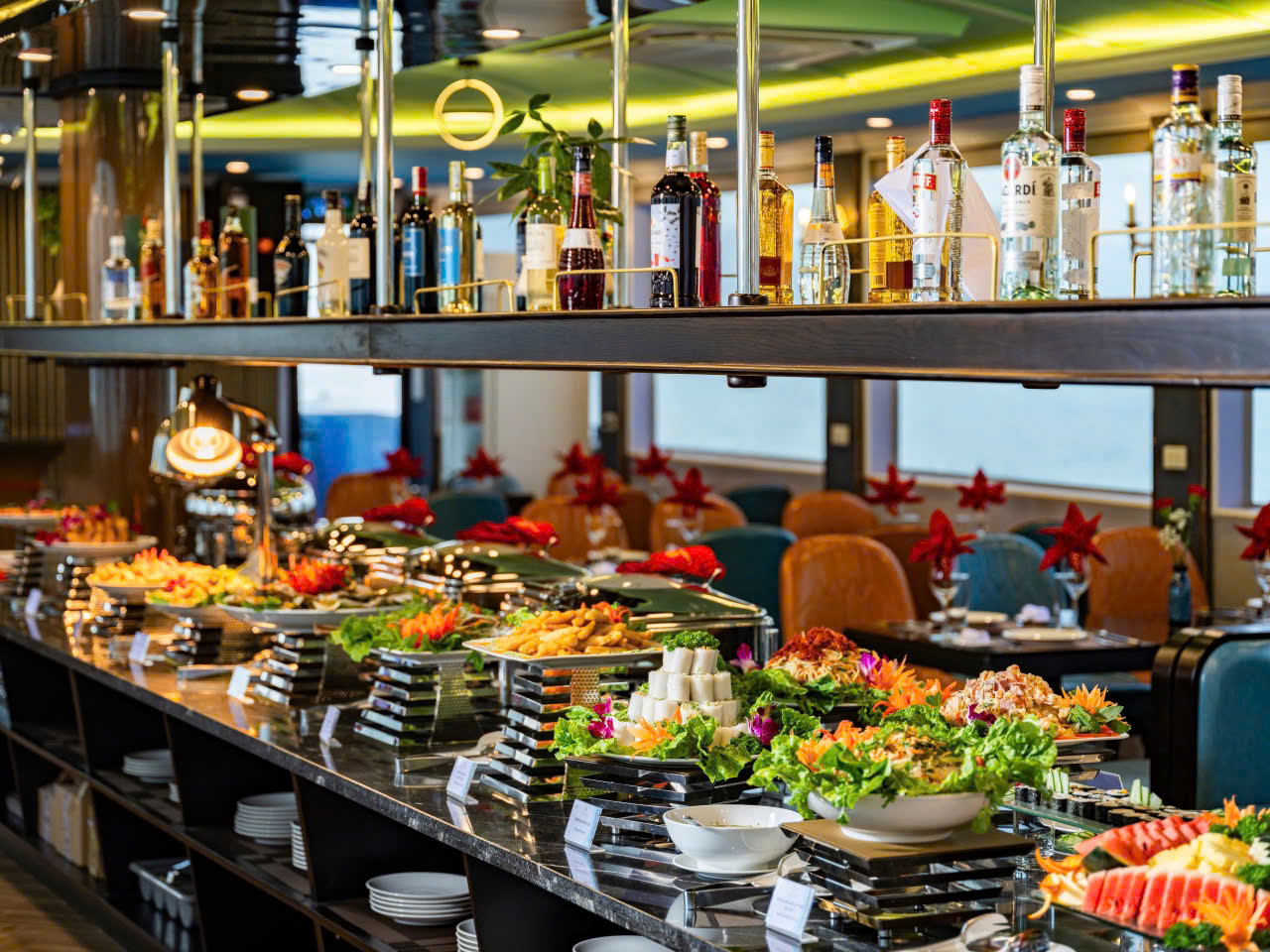 丰盛的自助午餐,包括海鲜和越南传统美食等各种菜肴