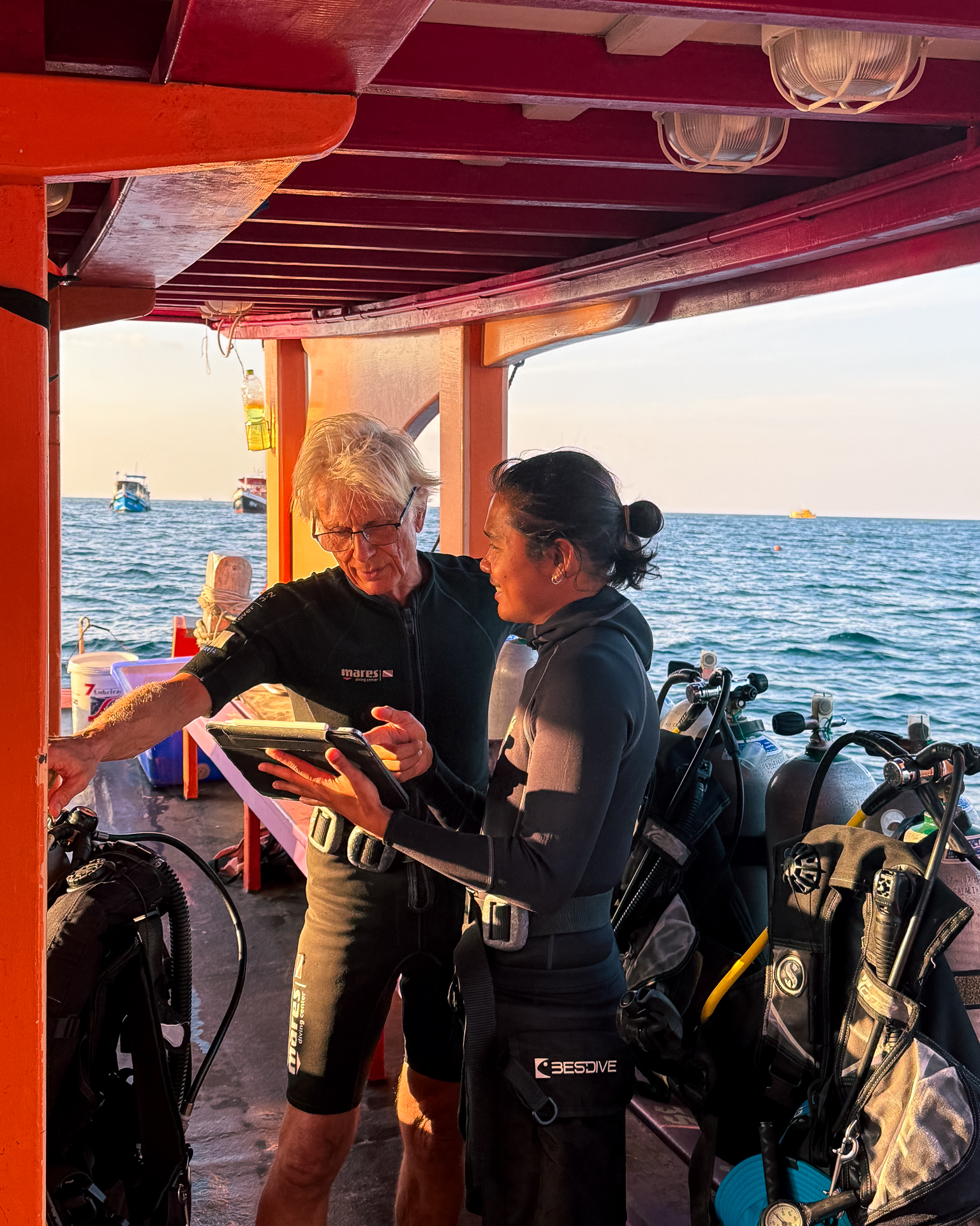 在涛岛度过难忘的一天潜水后,您可以在我们的海滨甲板上放松身心,欣赏令人惊叹的日落美景。