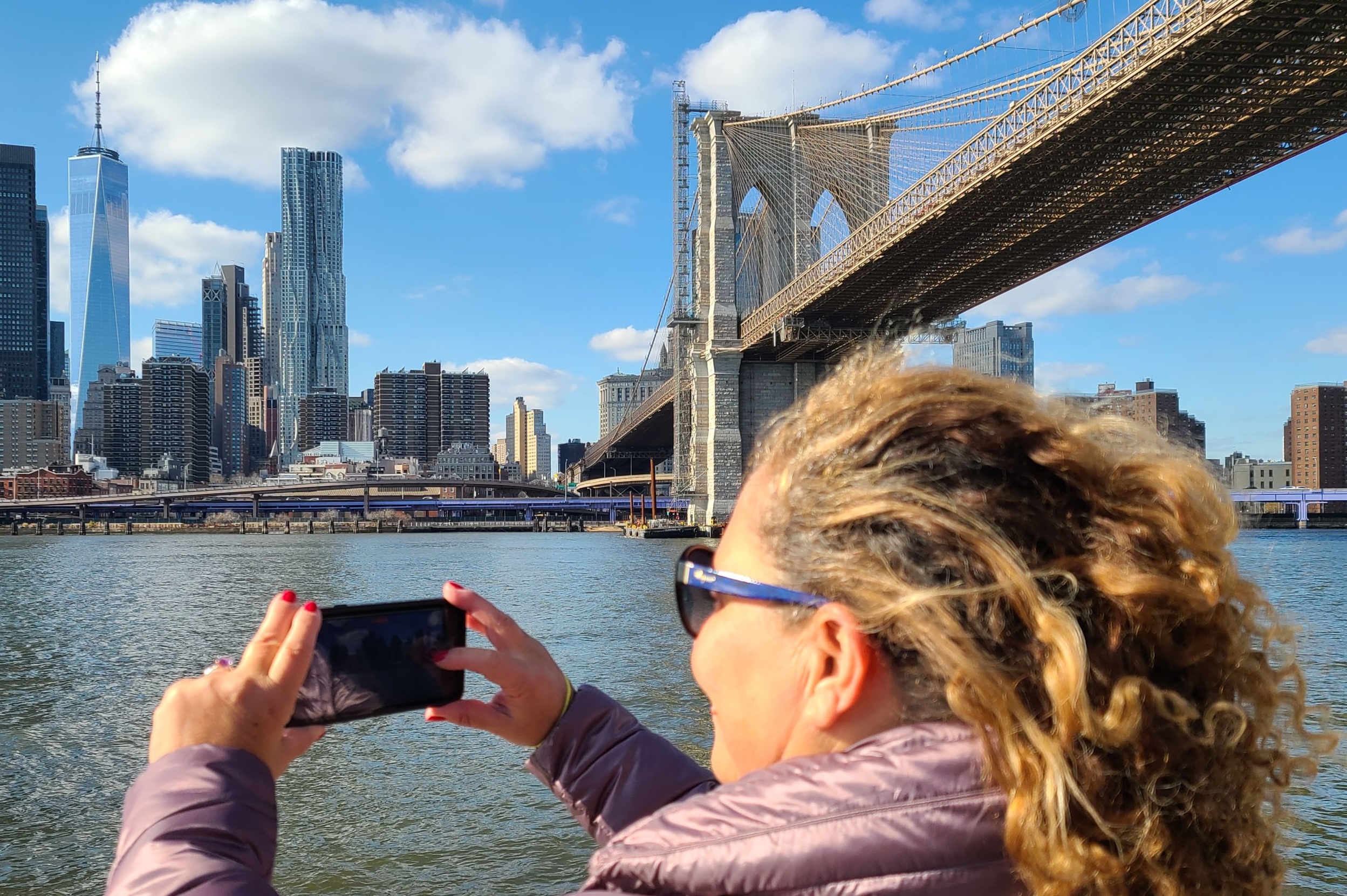 在布鲁克林大桥下巡游,以曼哈顿天际线为背景