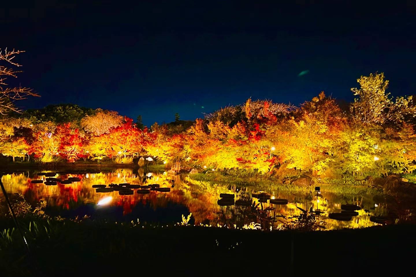 夜晚漫步在灯火辉煌的树林间