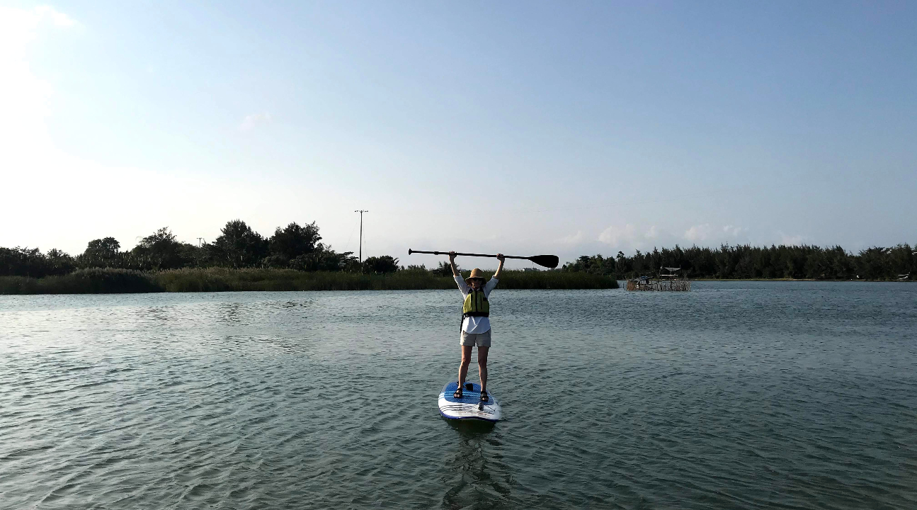 站起来举起双手,在桨板上测试您的平衡技巧