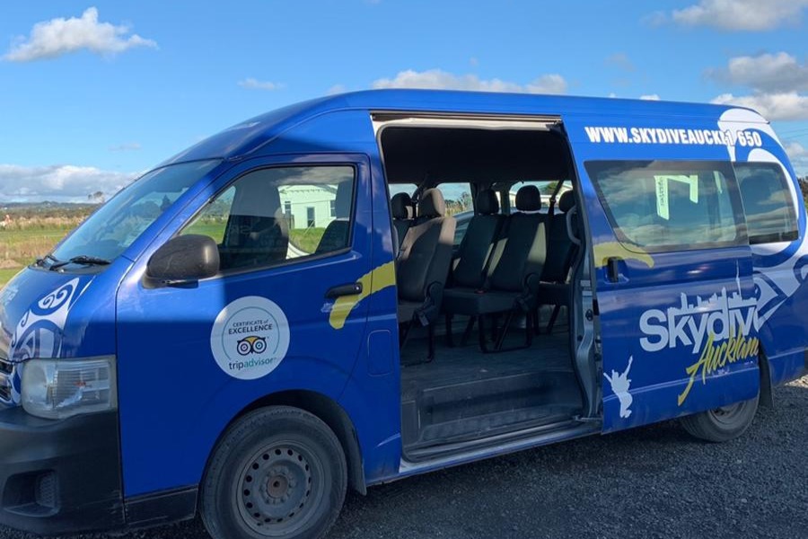 搭乘接驳车前往 Skydive Auckland 跳伞中心,舒适又便利