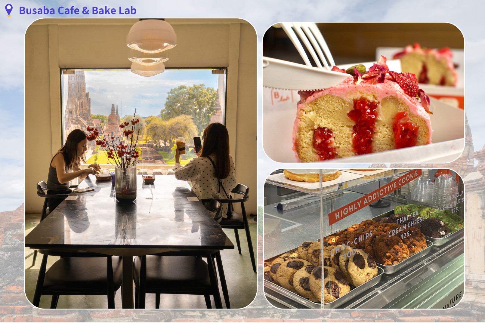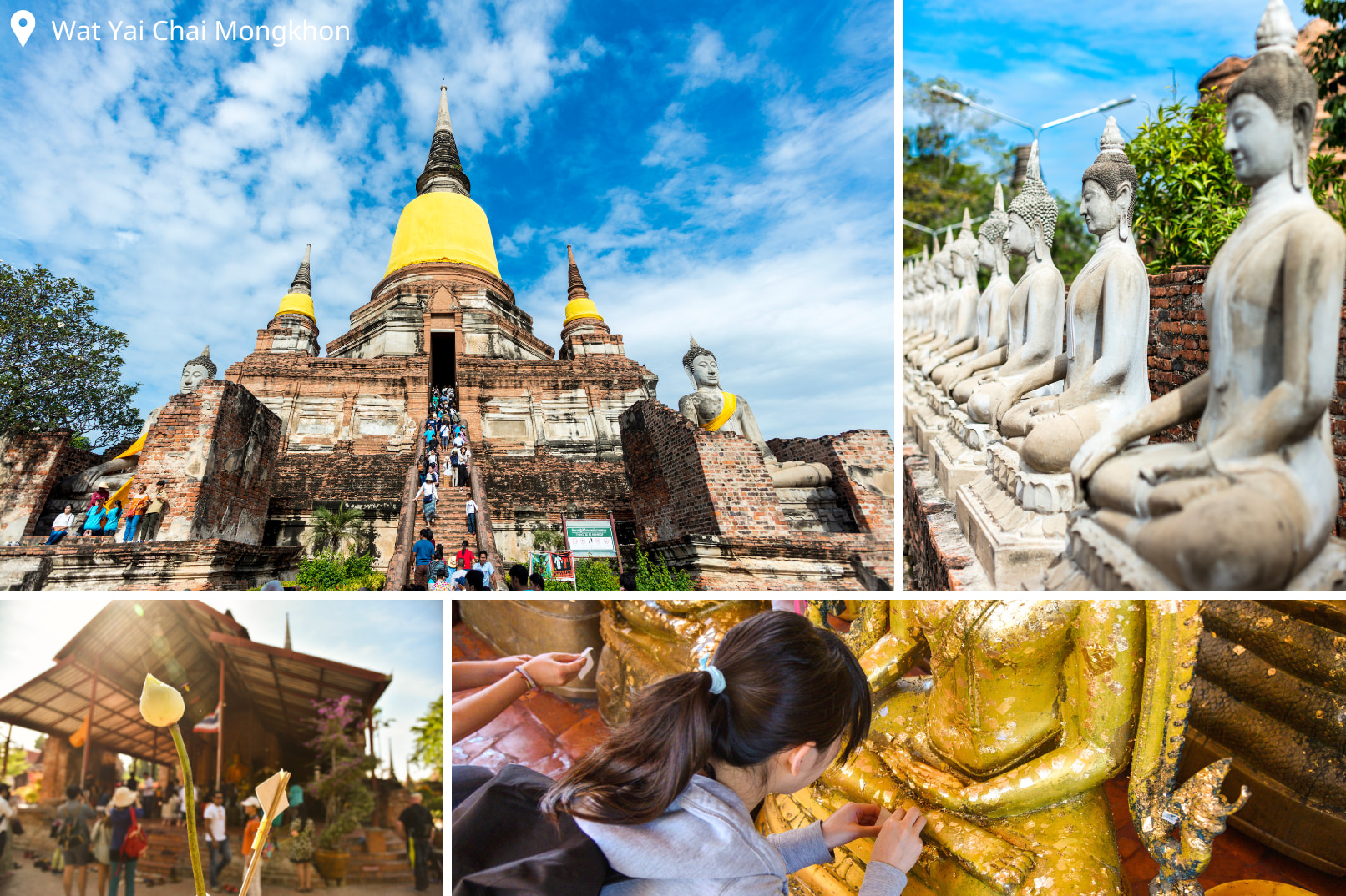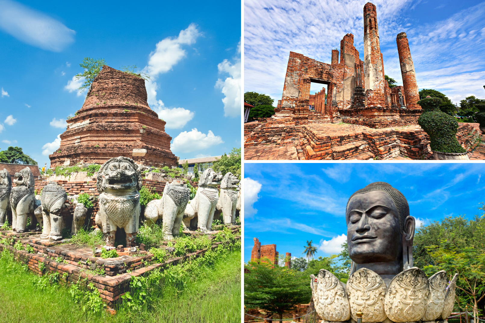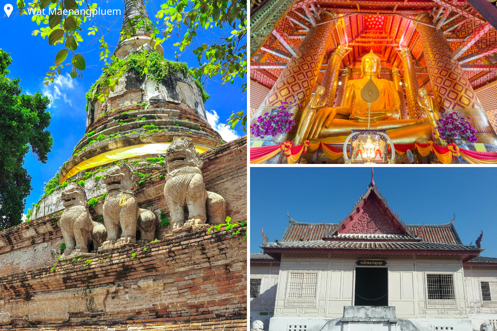 罗卡雅苏塔拉姆寺(Wat Lokaya Sutharam),大城府外最大的卧佛。(左下)拉查布拉纳寺(Wat Ratchaburana),泰国最古老的佛像壁画。(右下)帕西桑佩寺(Wat Phra Si Sanphet),曾是古代泰国大城王国的王宫