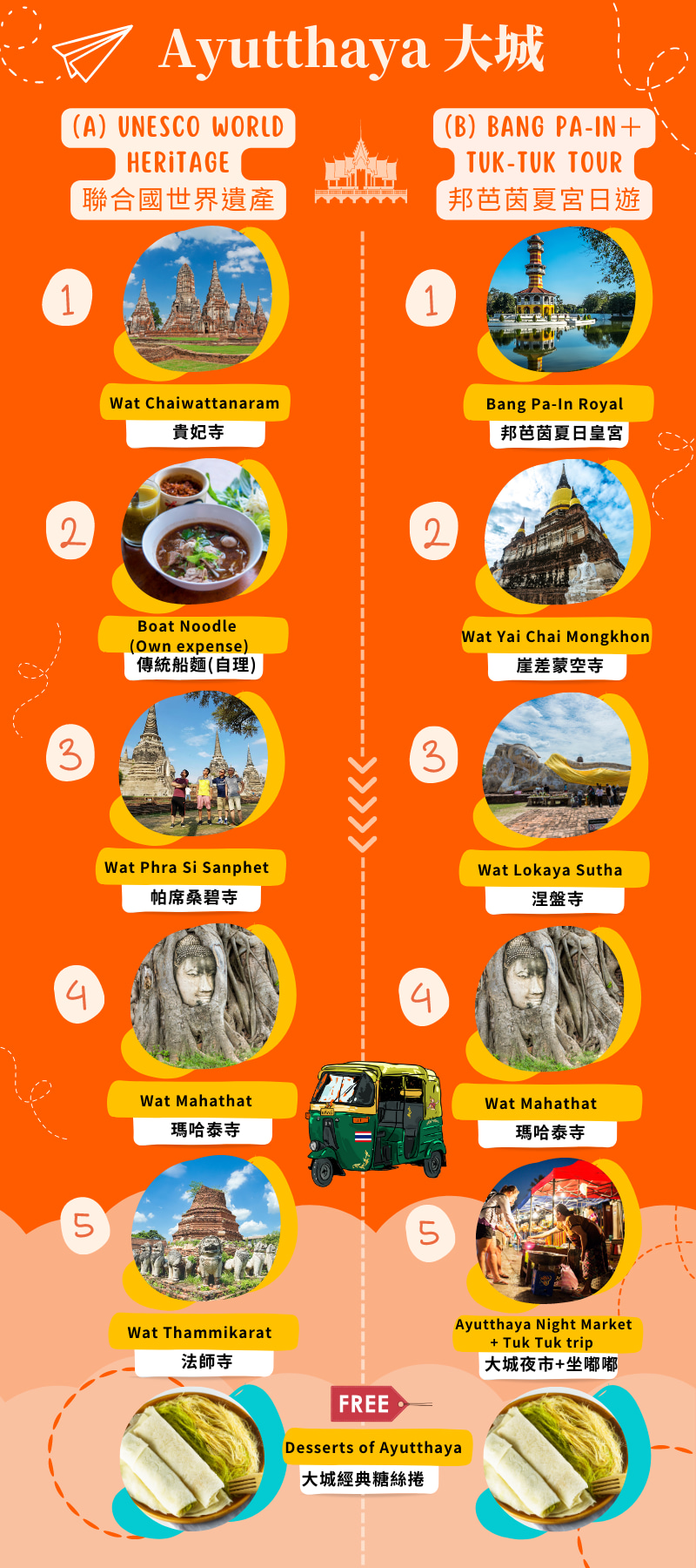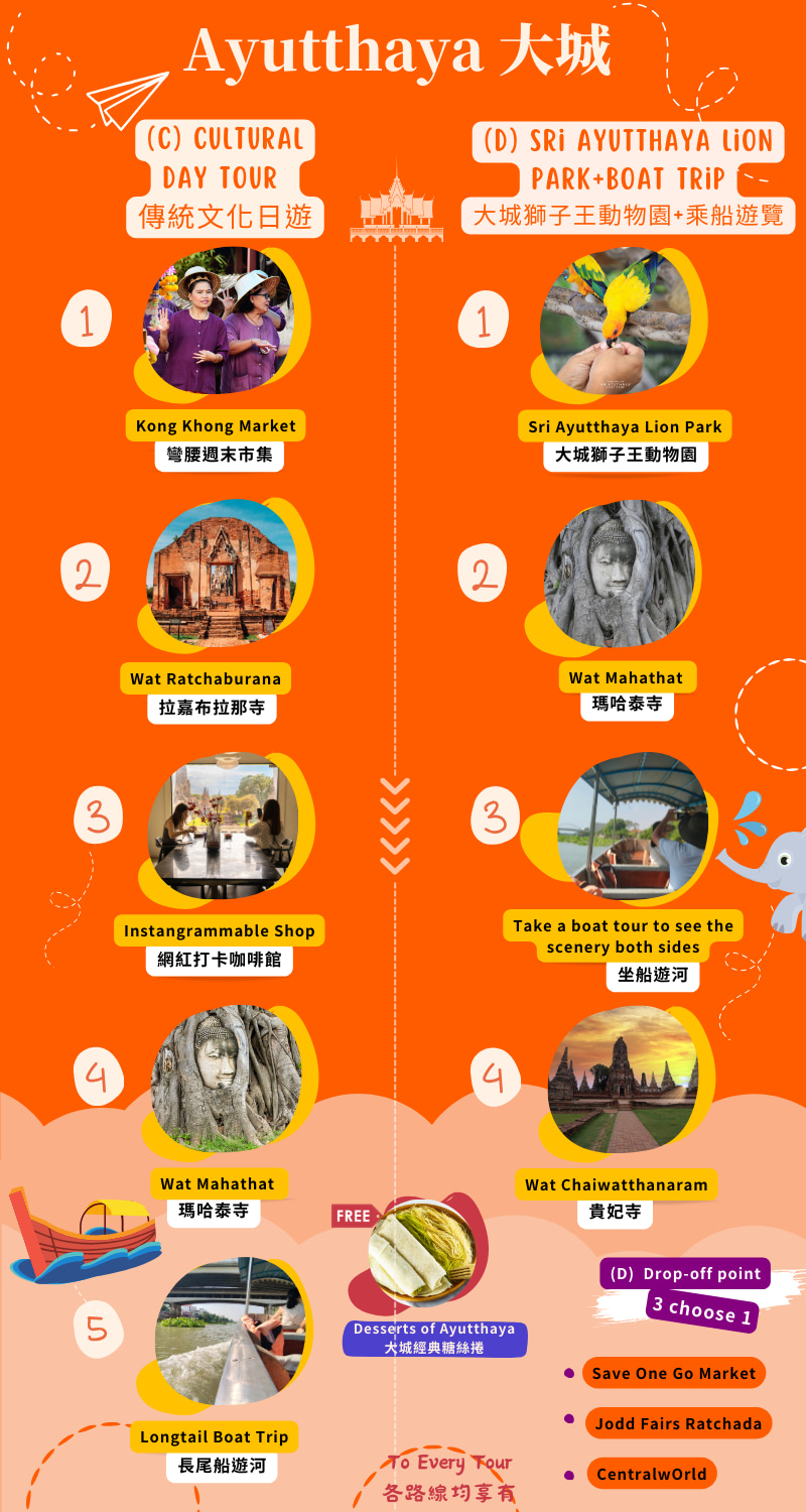 参观距离曼谷不远的泰国最古老的城市之一。大城府,暹罗王国的前首都。这里是泰国当今最重要的一些文物的所在地。对泰国的历史印象深刻,被联合国教科文组织列为世界遗产。在 Wat Yai Chai Mongkhon 参观著名的卧佛像。参观拥有 300 多年历史、建筑精美的邦芭茵宫,并欣赏精美的纪念品。停下来享用美味的船面午餐。您想在咖啡馆放松一下吗?来吧,在稻田边喝杯咖啡,享受微风和纯净的泥土氛围。乘坐嘟嘟车游览岛屿和当地夜市。大城府有很多套餐可供选择。我们可以为您安排!