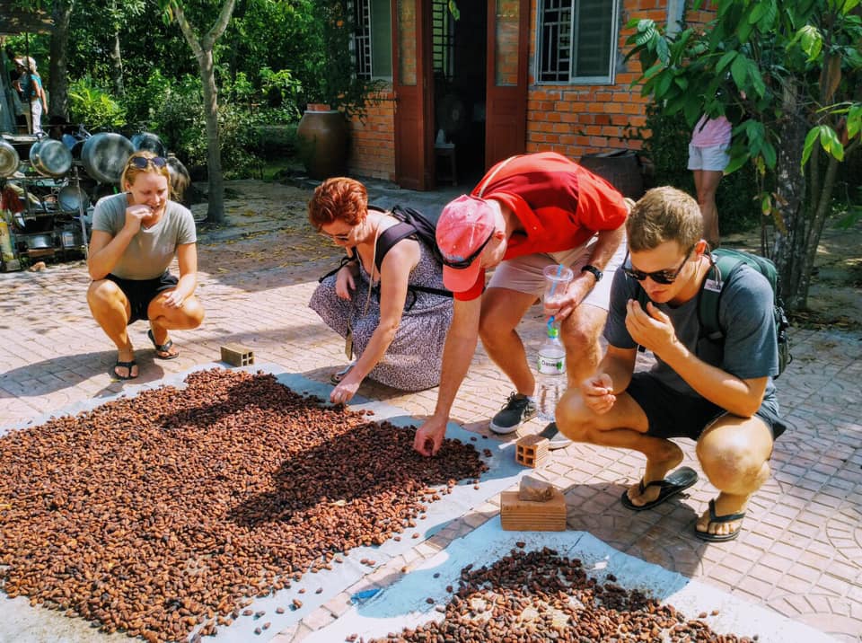探索市场后,前往当地的可可农场,探索可可种植和巧克力生产的秘密。漫步穿过郁郁葱葱的果园,了解可可树的生长过程,并观察工匠用当地原料制作美味的巧克力。尽情品尝浓郁的手工巧克力,亲身体验湄公河三角洲的风味。