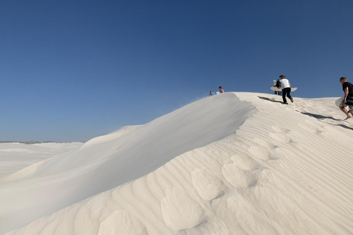 在 Pinnacles 沙漠广阔的沙丘上滑沙