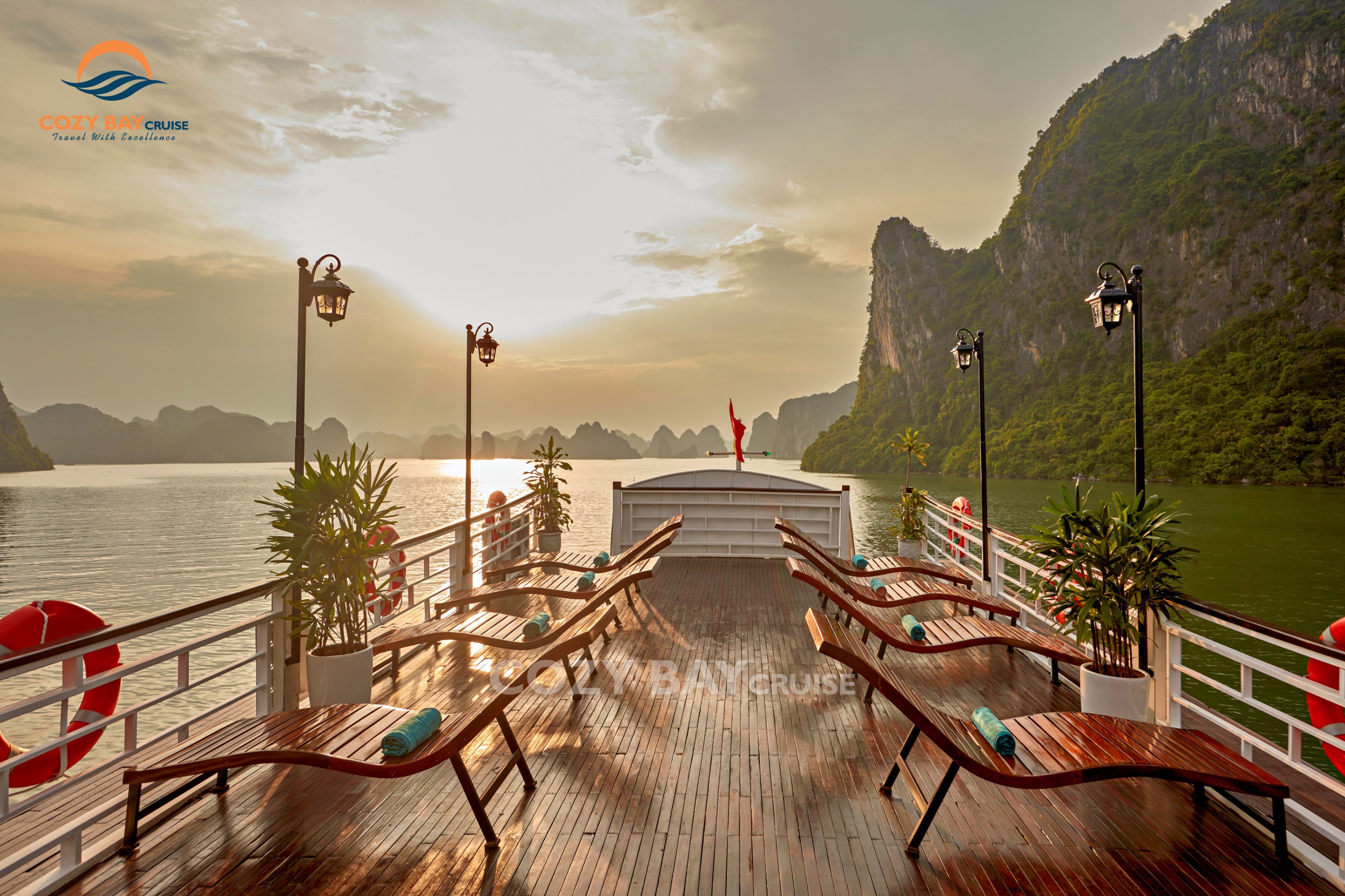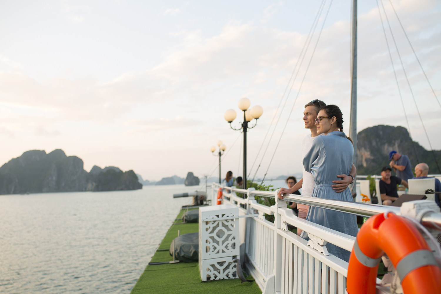 沿着下龙湾观光时,在船的日光浴平台放松一下