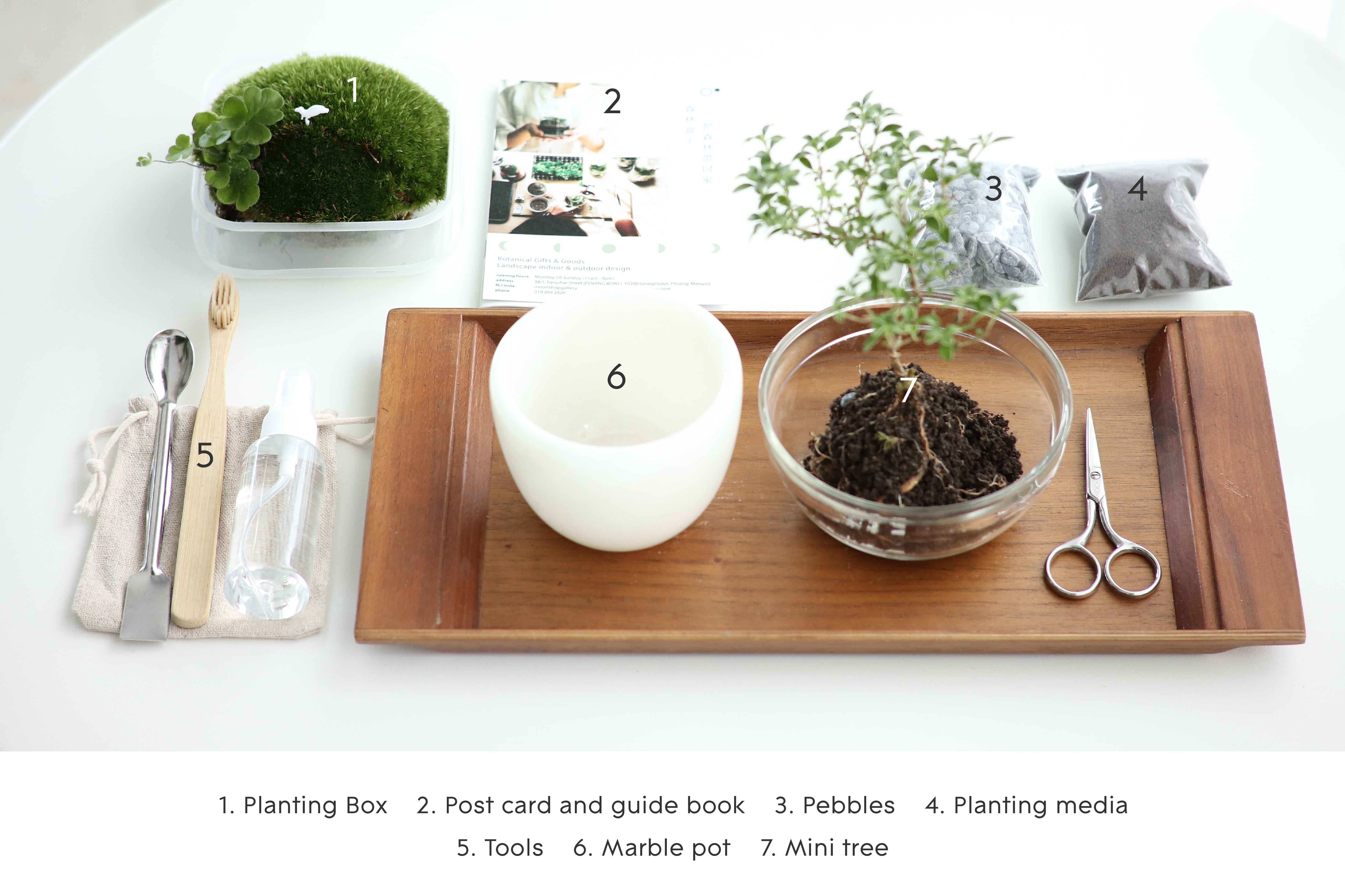 大理石森林 DIY 套件包括必要的种植介质和材料、花盆、工具、水壶和一棵迷你树
