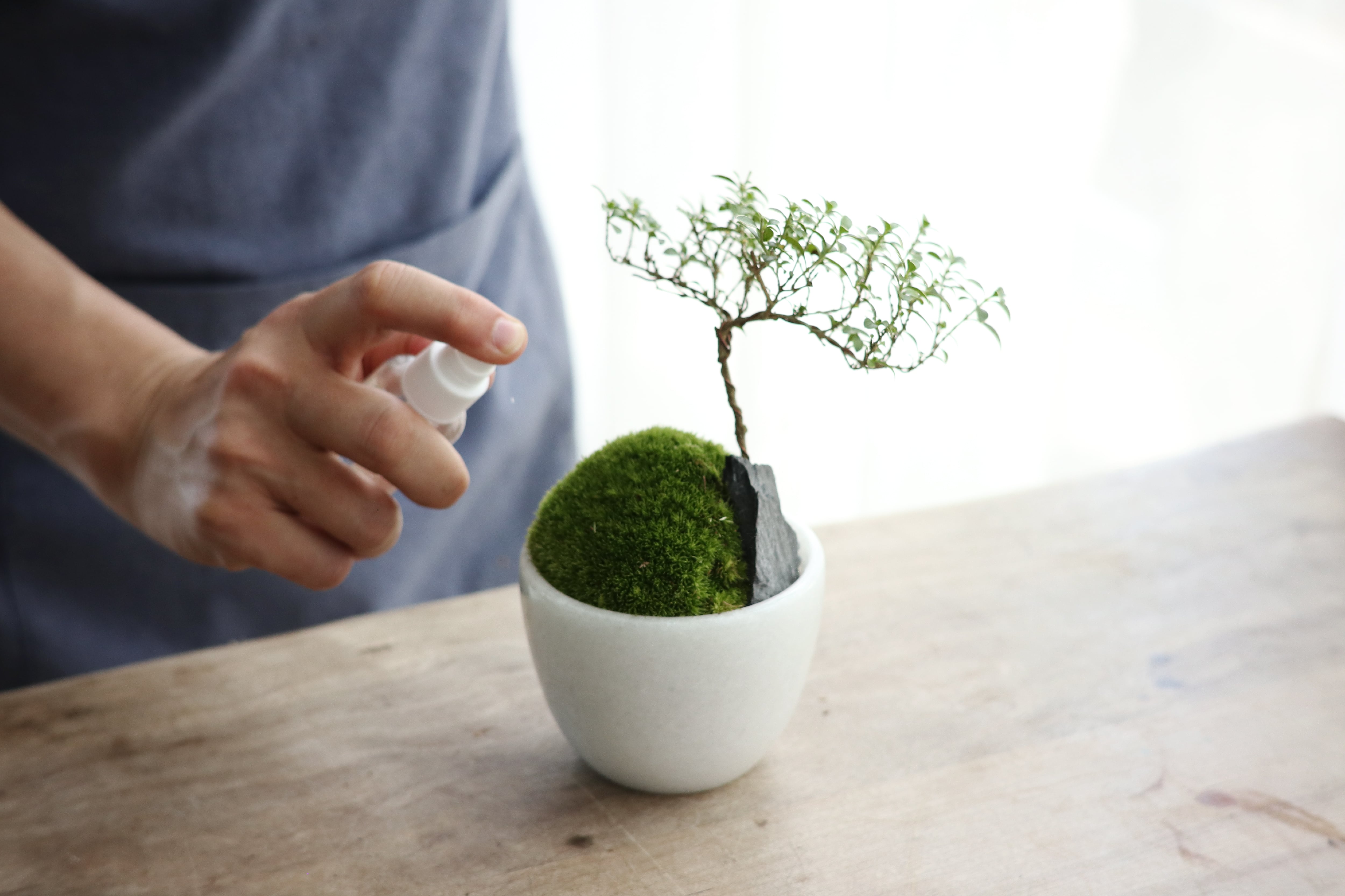 光滑、华丽的大理石花盆中的绿色苔藓和盆景将完美展现自然的和谐