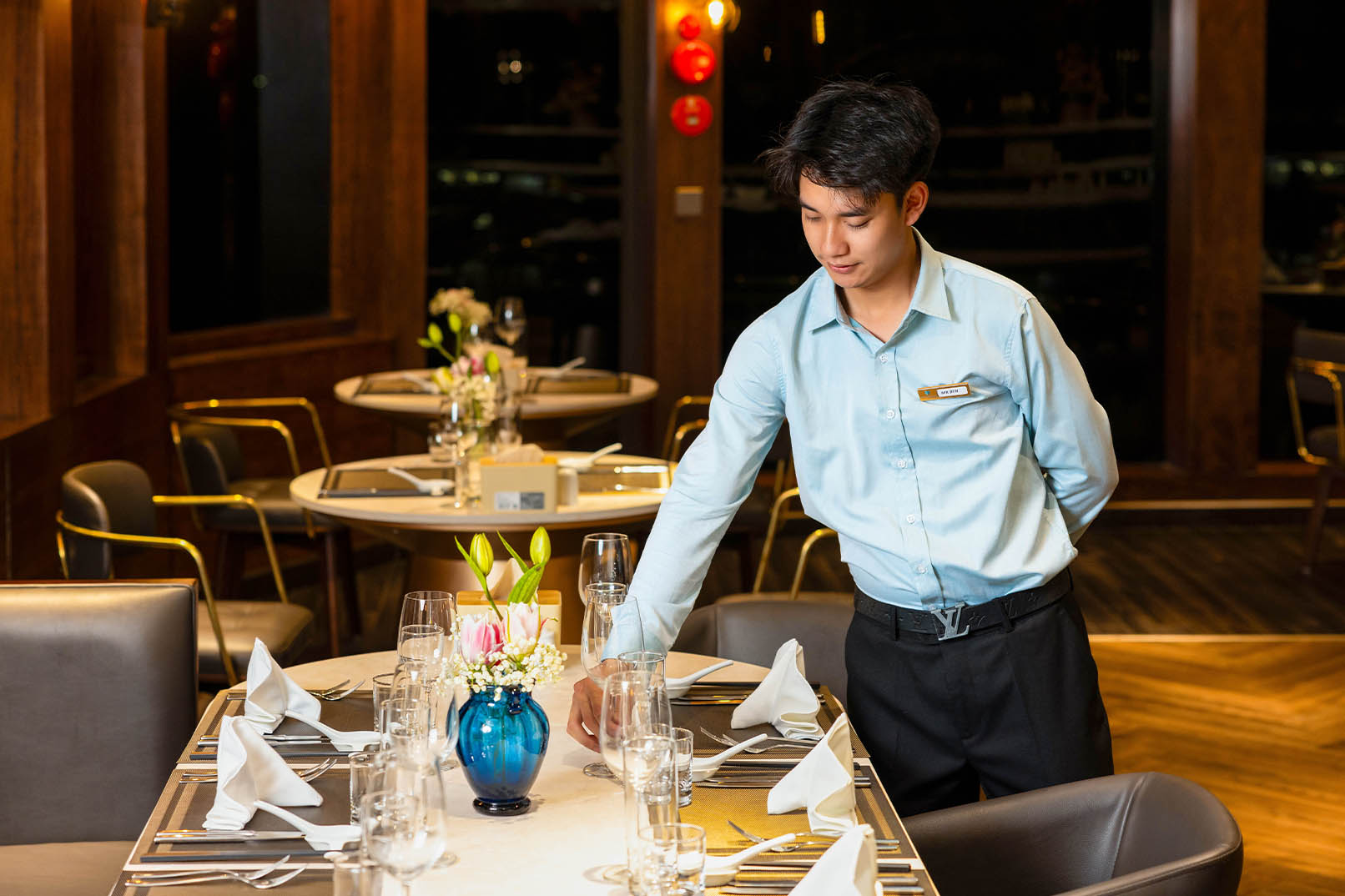 餐厅设计精美,采用木材和金属元素,具有独特的越南风格