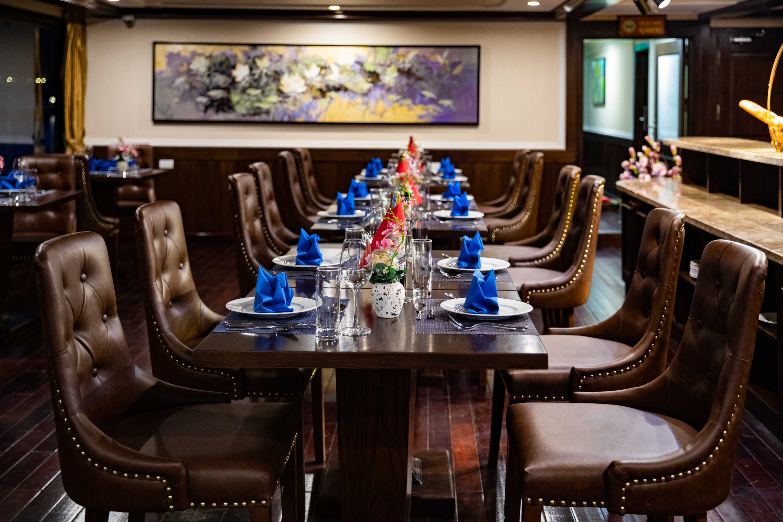 第二层甲板面积 120 平方米的餐厅拥有豪华的环境、私密而舒适的氛围,并配有大型全景窗户