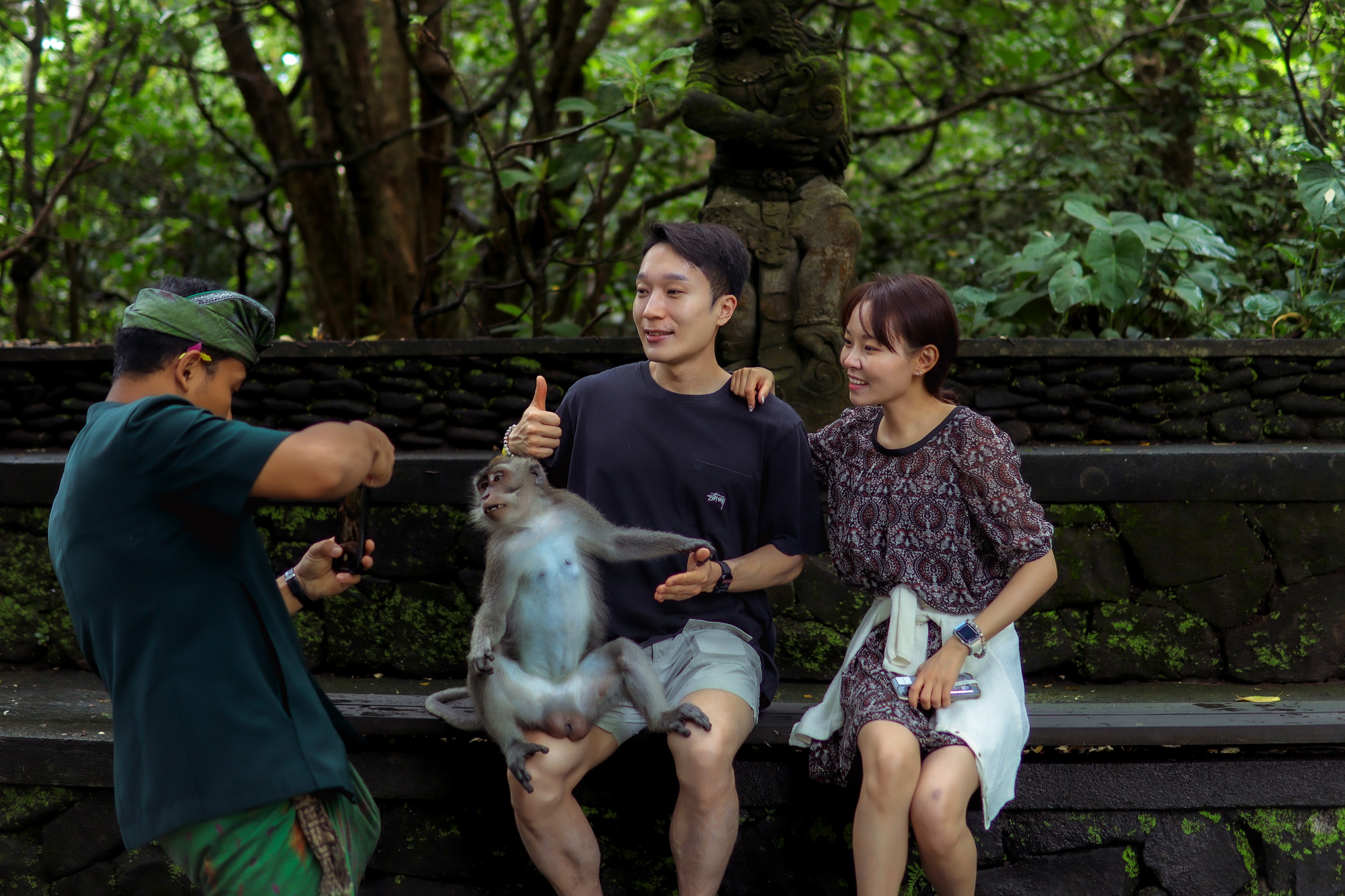 在猴子森林里与猴子合影