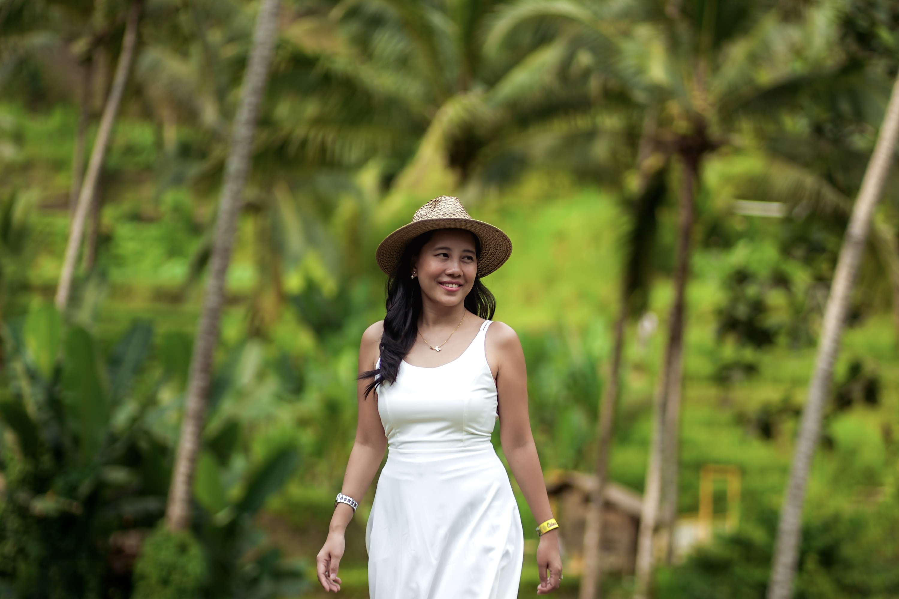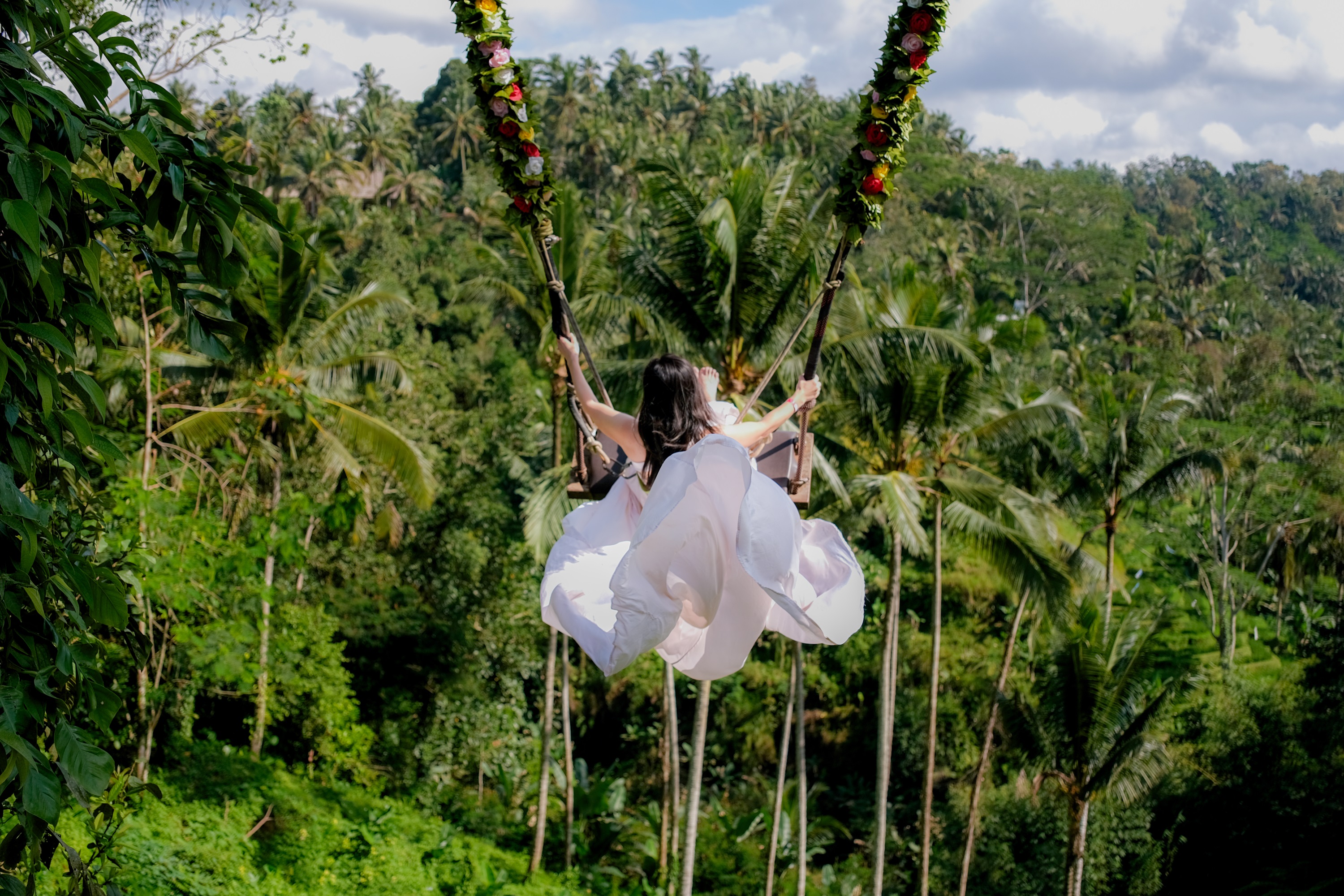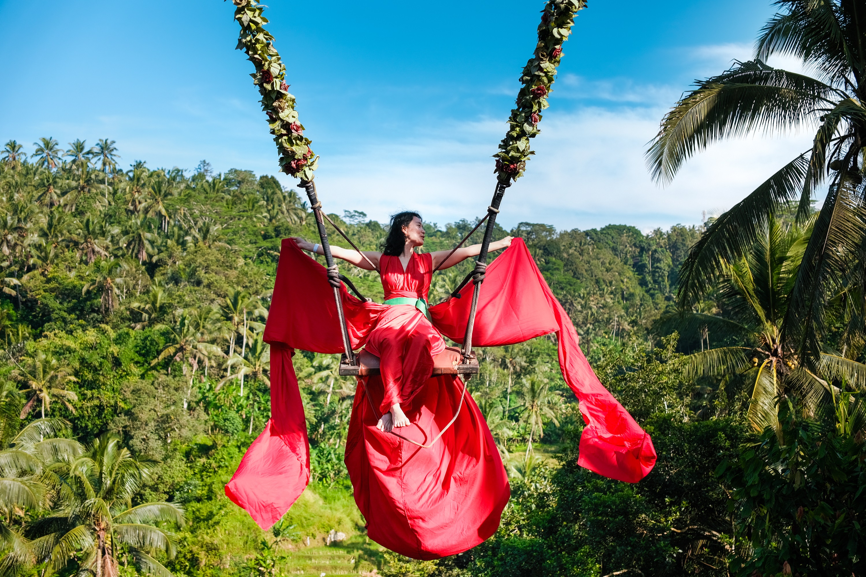 穿着美丽的长裙在峇里岛快乐秋千上荡秋千,在丛林上空荡荡