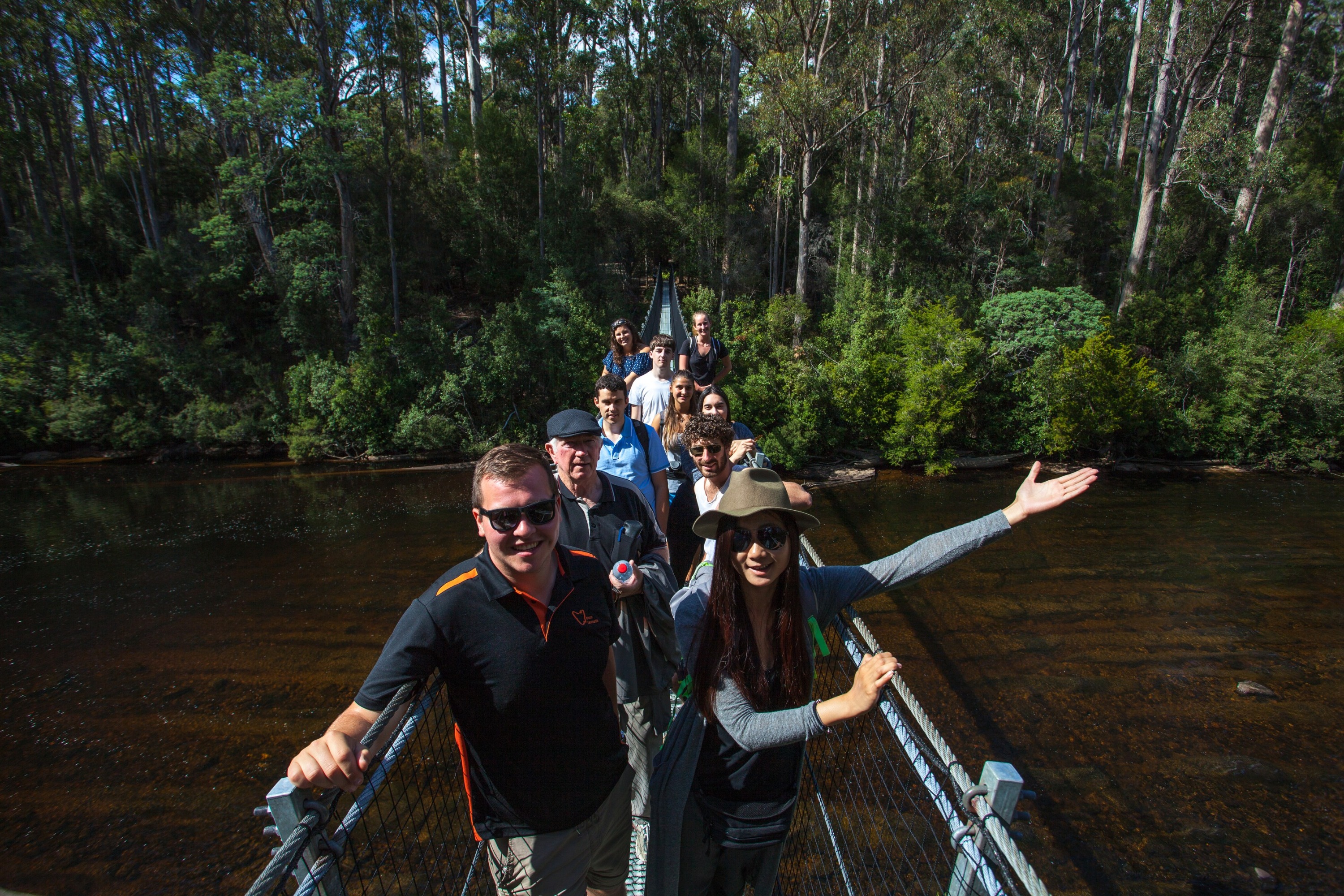对于敏锐的步行者,我们将在地面继续我们的环路步行。吊桥轨道带我们穿过 Huon 河,桥跨度为 100 米,这是另一种激动人心的体验,也是拍摄有趣照片的绝佳地点。紧随其后的是另一条河道和另一条跨度为 60 米的吊桥。