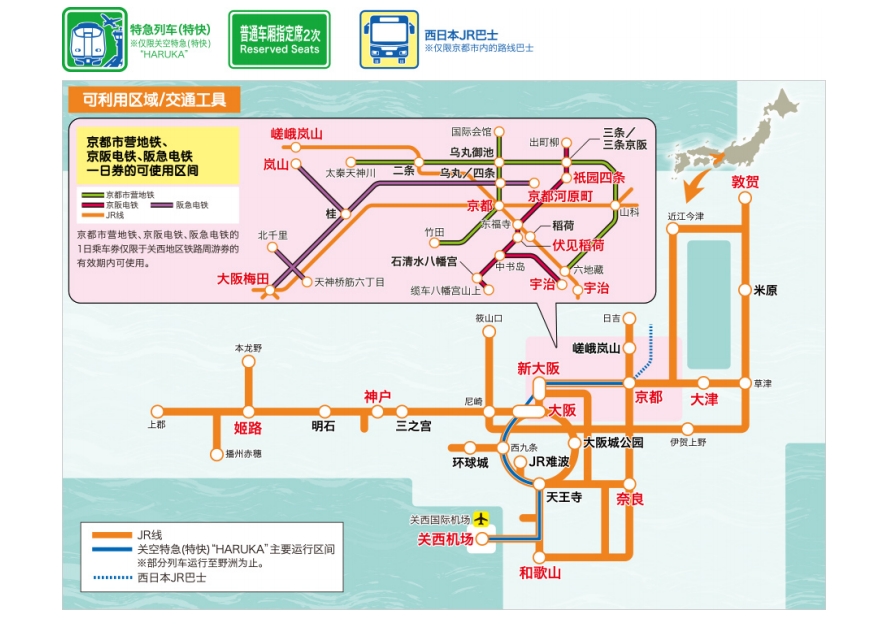 购买关西地区铁路周游券还可免费获得京都市营地铁、京阪电车、阪急电车[1日券](https://res.klook.com/image/upload/voucher_rjzajo.pdf?spm=Activity.activity_summary.Link&clickId=f9aedcfeb1&_gl=1*be1ig7*_gcl_aw*R0NMLjE3MzU4ODMxMzguQ2owS0NRaUFqOW03QmhEMUFSSXNBTnNJSXZCdXRVcnVxYXZkcEpTRnJ VUTJTY3JfR1U4ajJwU0FWZ0d0T3o1R1lPUDJxTWNjTkZlM1NaY2FBb2F0RUFMd193Y0I.*_gcl_au*Mzg4MDcwNzQxLjE3MzQ2ODY1MDQ.*_ga*NTM2NDkzMzU1LjE2OTM5MDQwMjA.*_ga_V8S4KC8ZXR*MTczNzEwOTY2OS4zMjQuMS4xNzM3MTEwMDQ0LjAuMC4xOTA5OTYxMDk5),**不含关西地区铁路周游券3日电子票套餐**