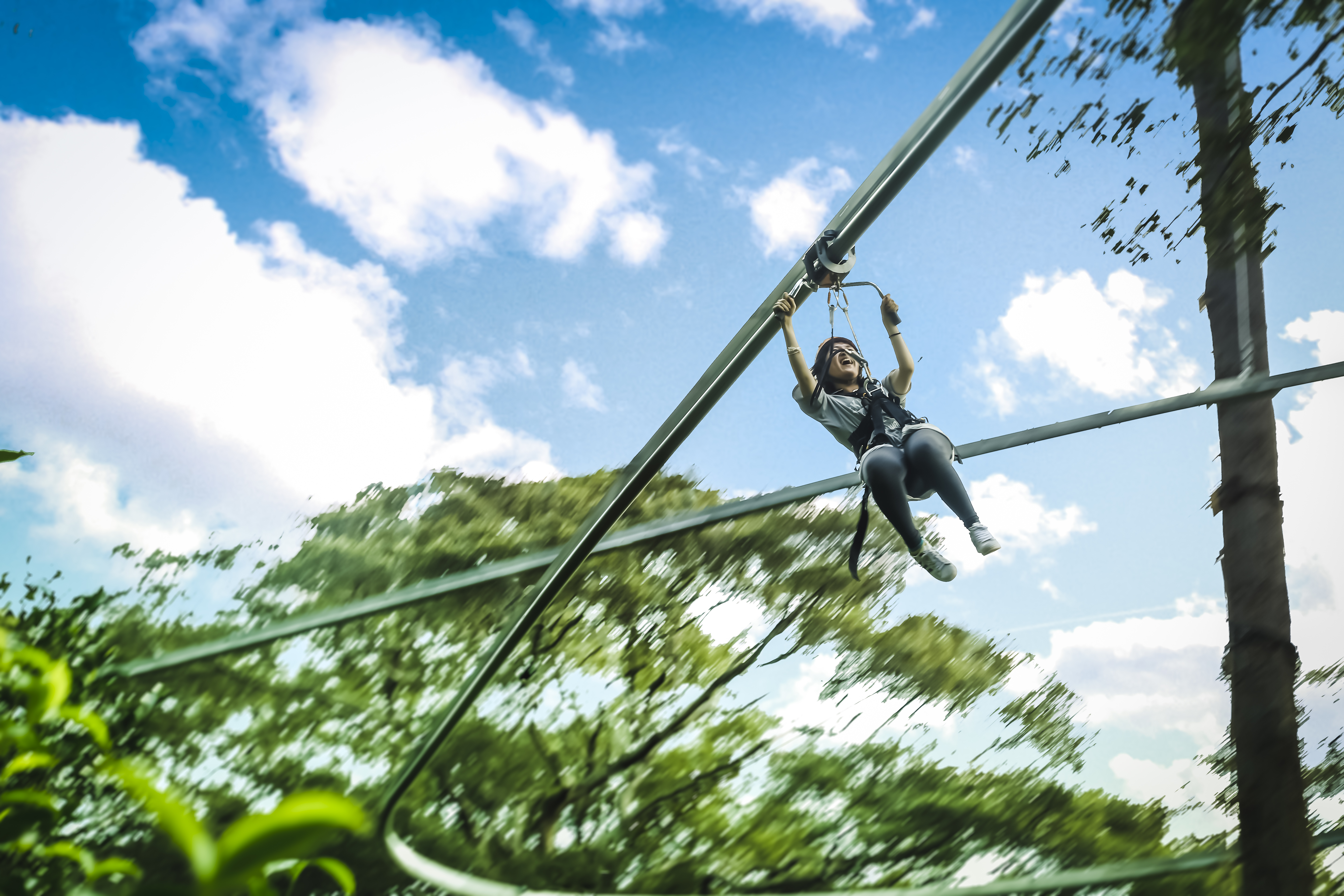 在高空滑索过山车上体验更上一层楼的滑索探险——只为勇者准备!